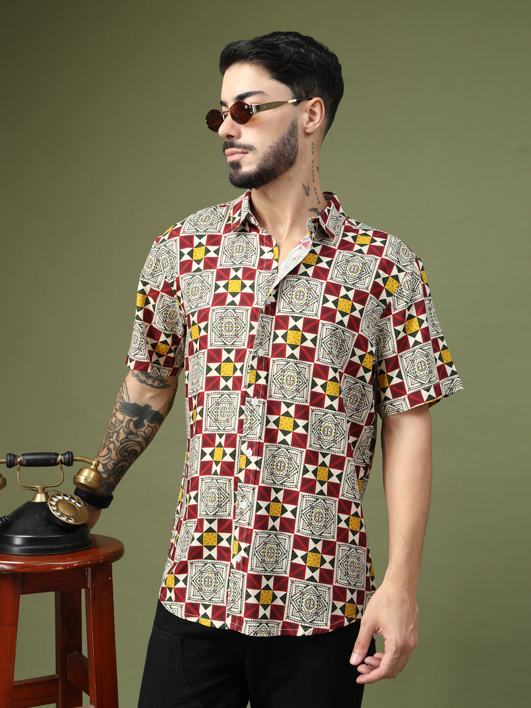 Green Geometric Print Short Sleeve Shirt with Ethnic Border