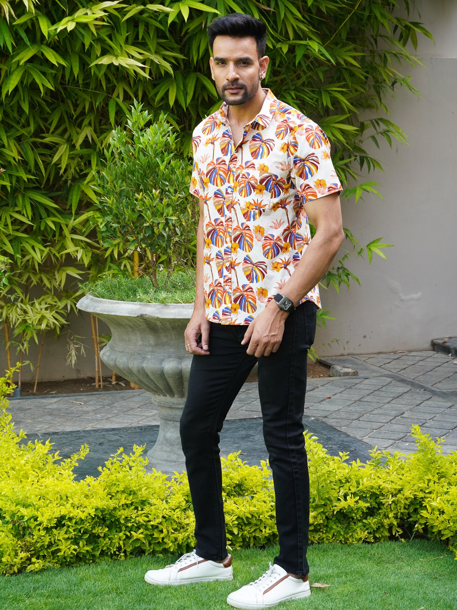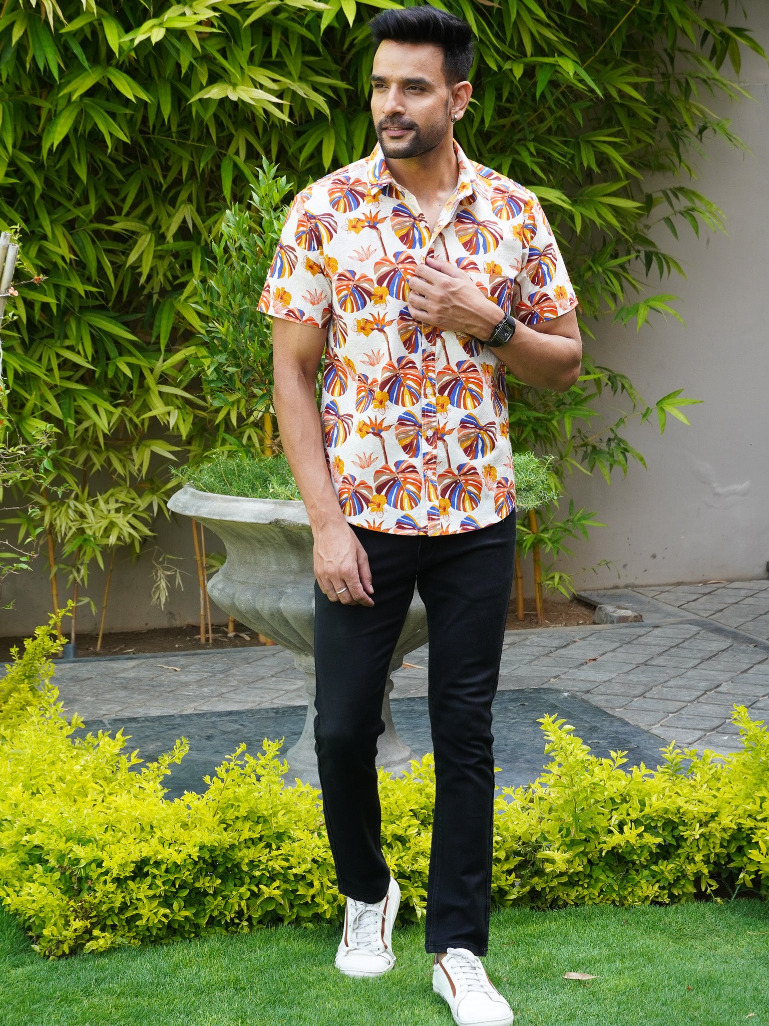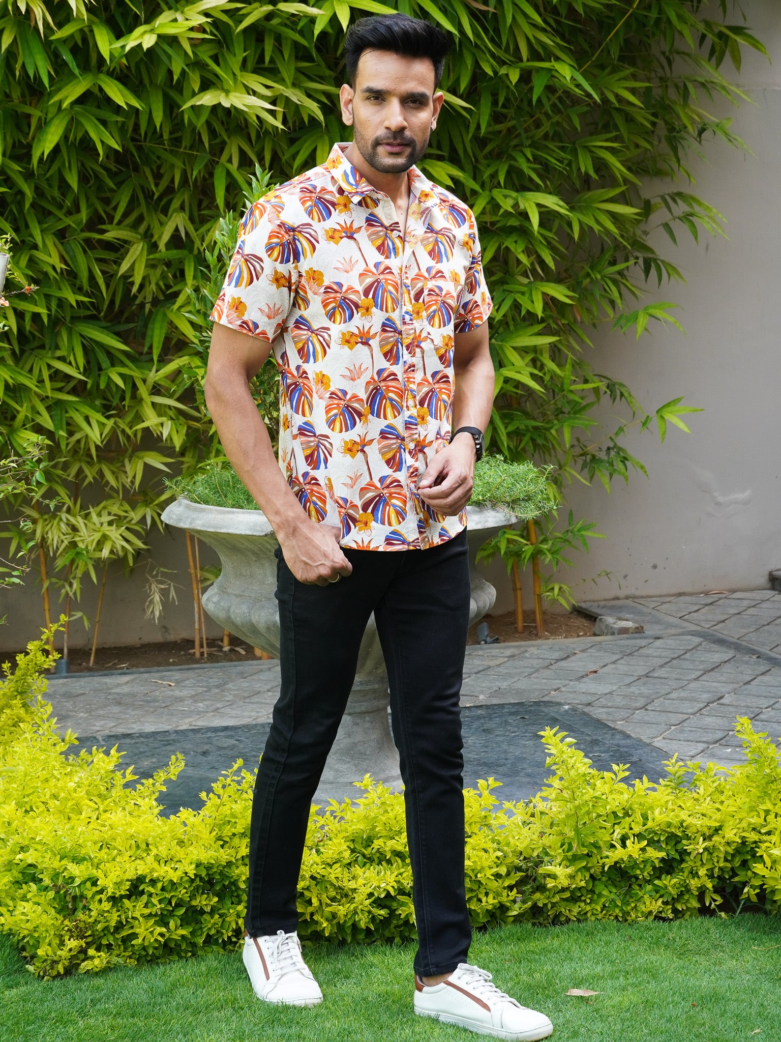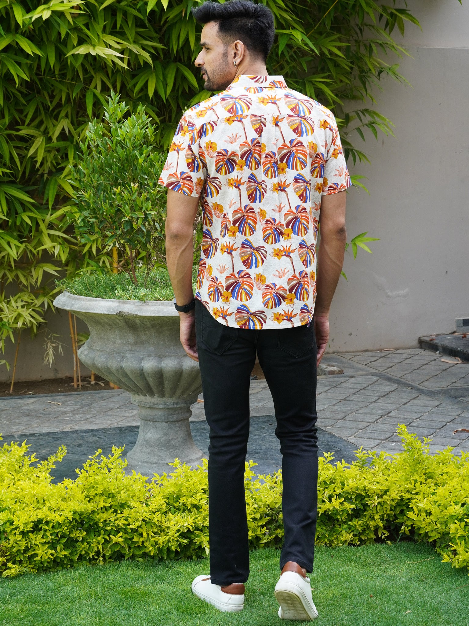 This Tropical Multicolor Leaf Printed Shirt brings a burst of sunset oranges, ocean blues and earthy tones on a soft off-white base for a look that instantly feels refreshing and stylish. Made from lightweight, breathable fabric, it keeps you cool and confident whether you're by the beach, at a brunch, or lighting up the weekend vibe.