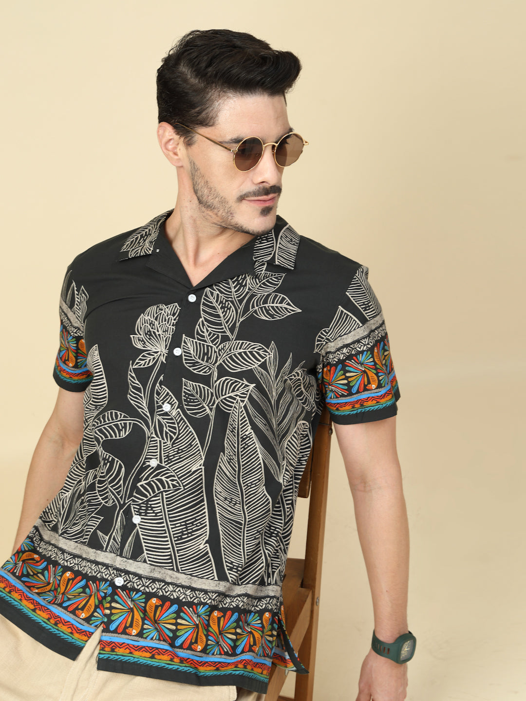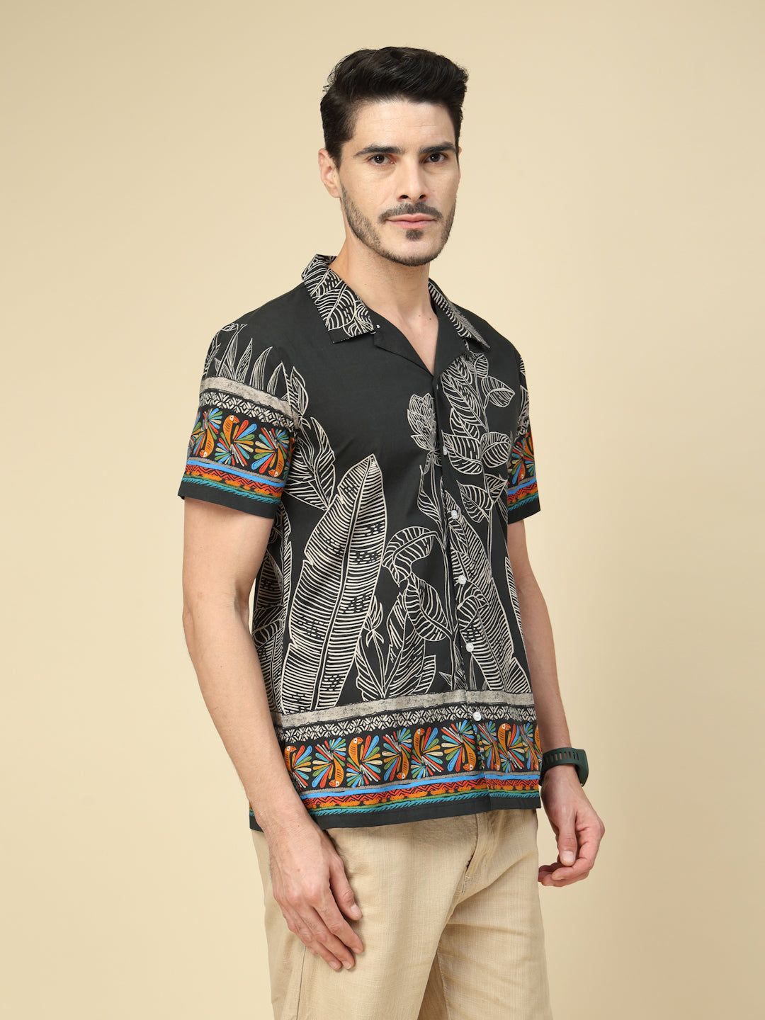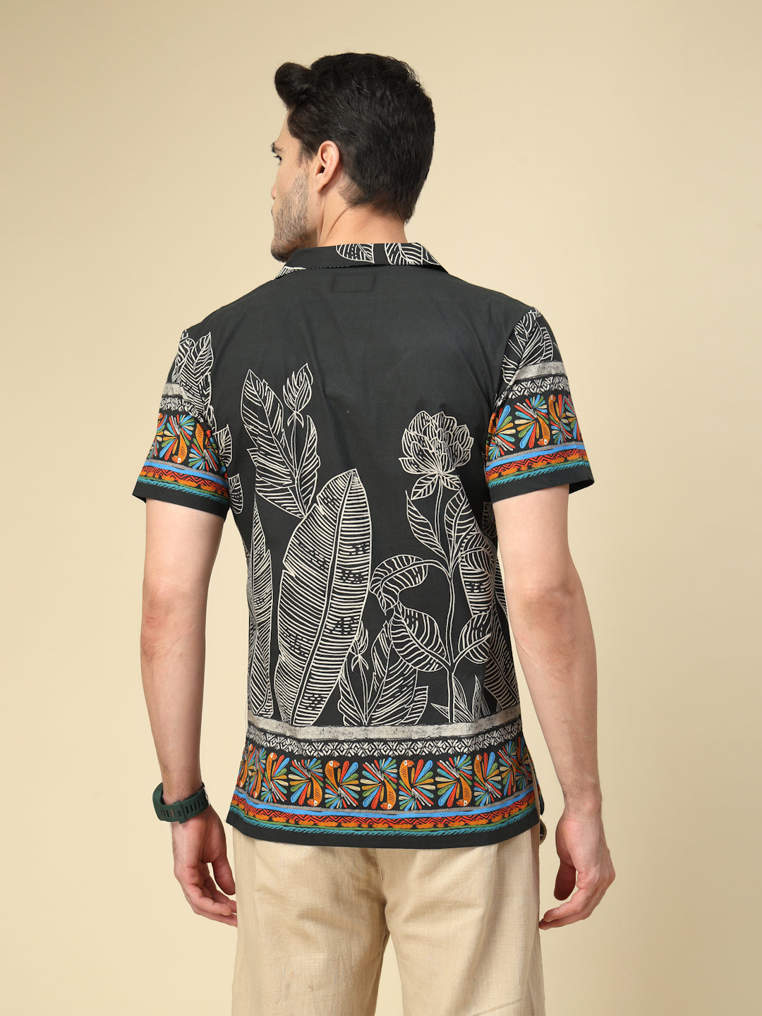 Black Tropical Leaf Print Cotton Shirt with Tribal Border Detailing
