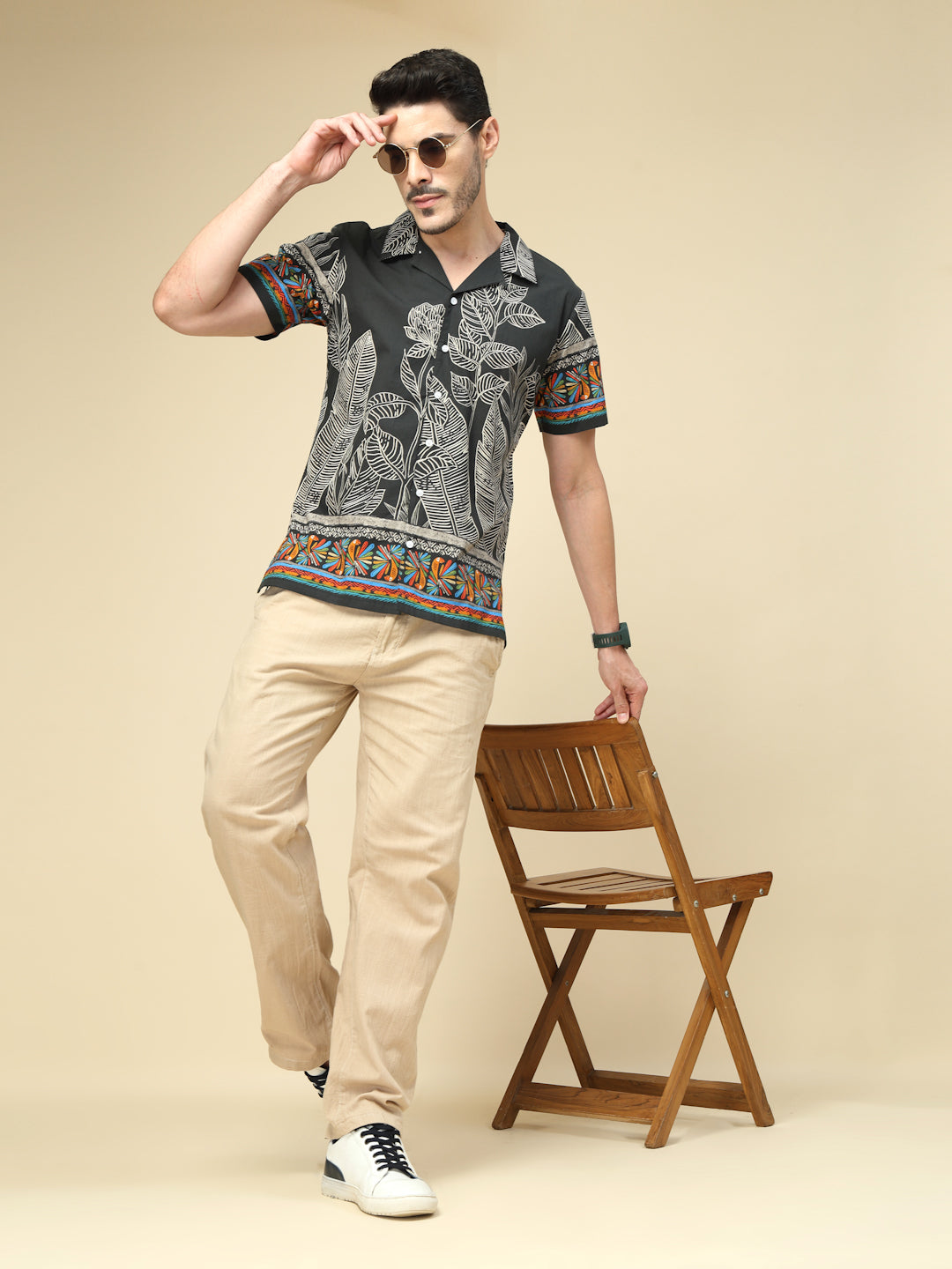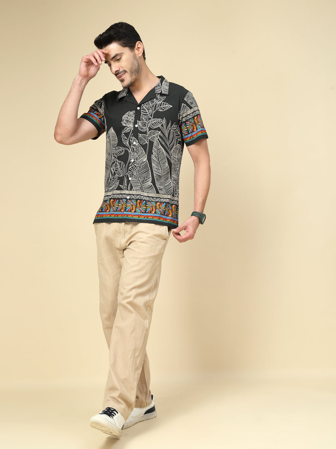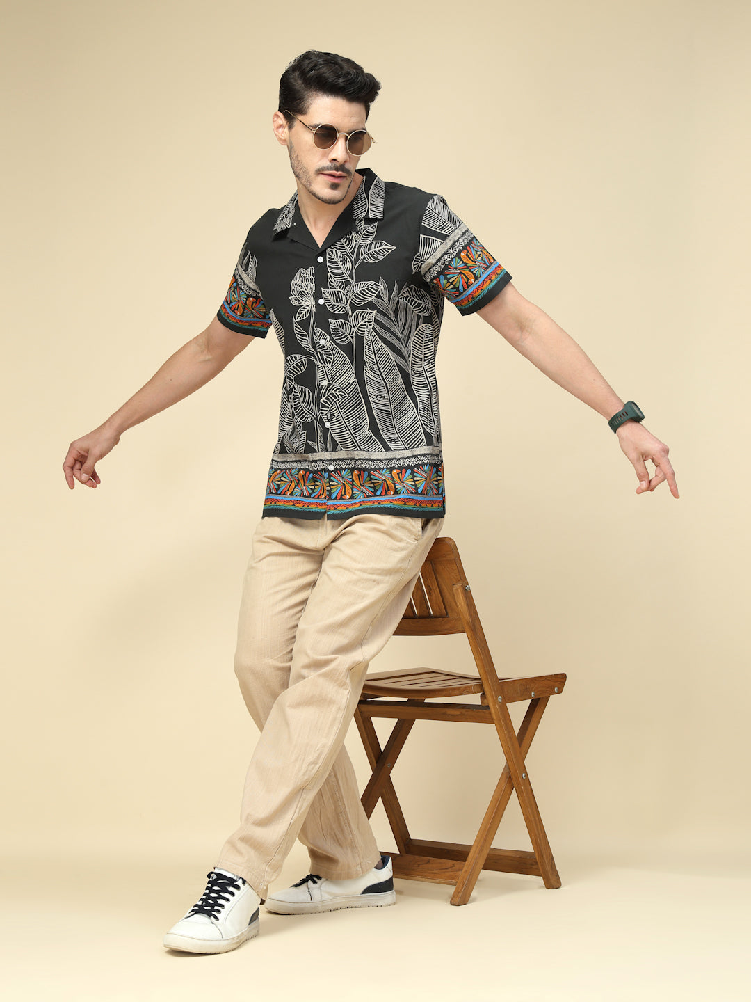 Elevate your casual style with this premium black cotton shirt featuring bold tropical leaf prints and vibrant tribal-inspired border detailing on the sleeves and hem. Designed for comfort and a relaxed fit, this half-sleeve shirt combines earthy tones with artistic patterns, making it a perfect pick for vacations, festive gatherings, or a stylish everyday look. Pair it with chinos or shorts for an effortlessly dapper vibe.