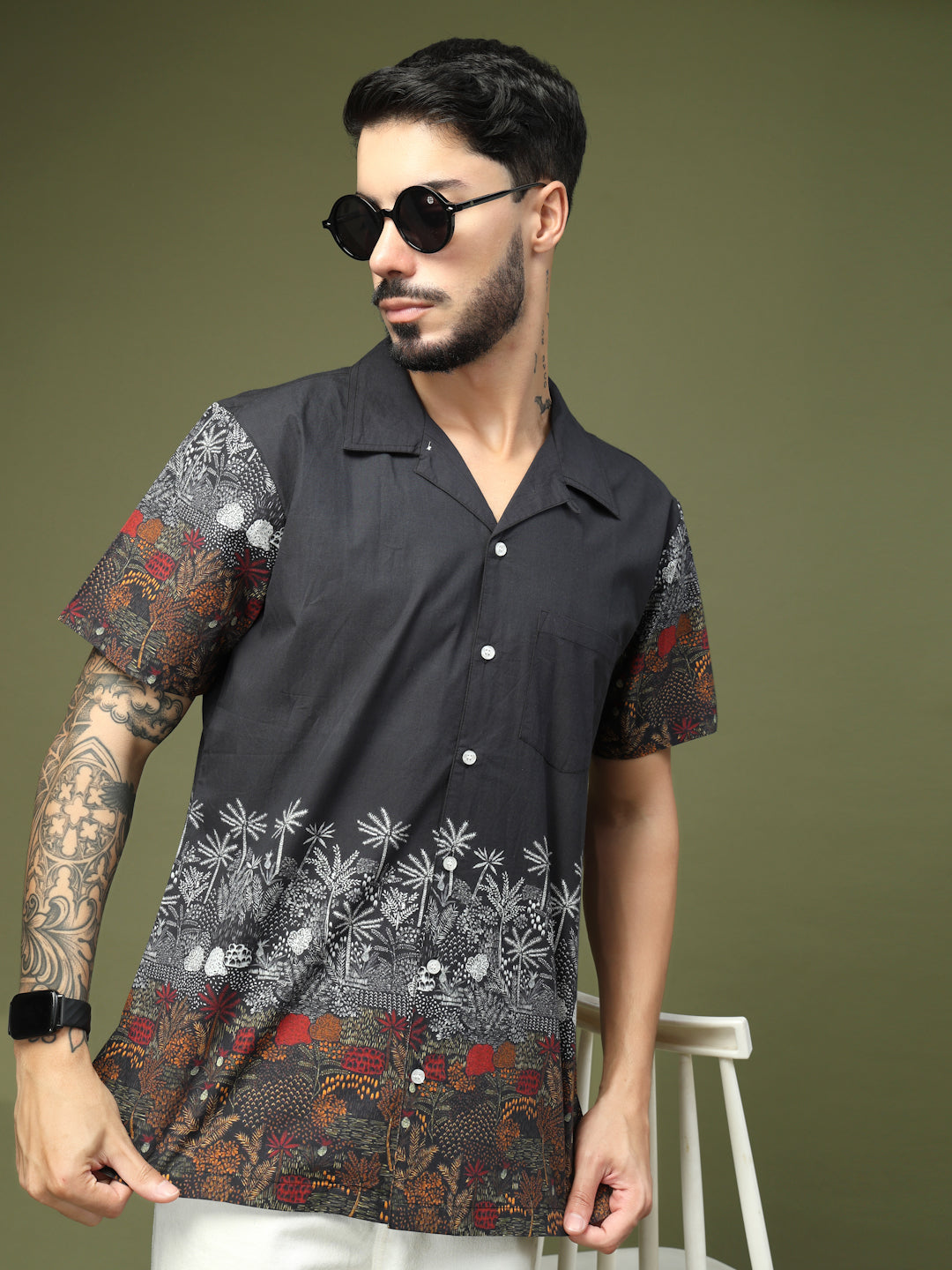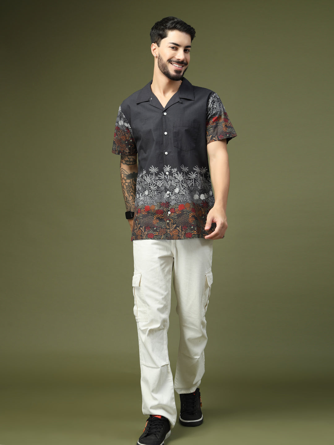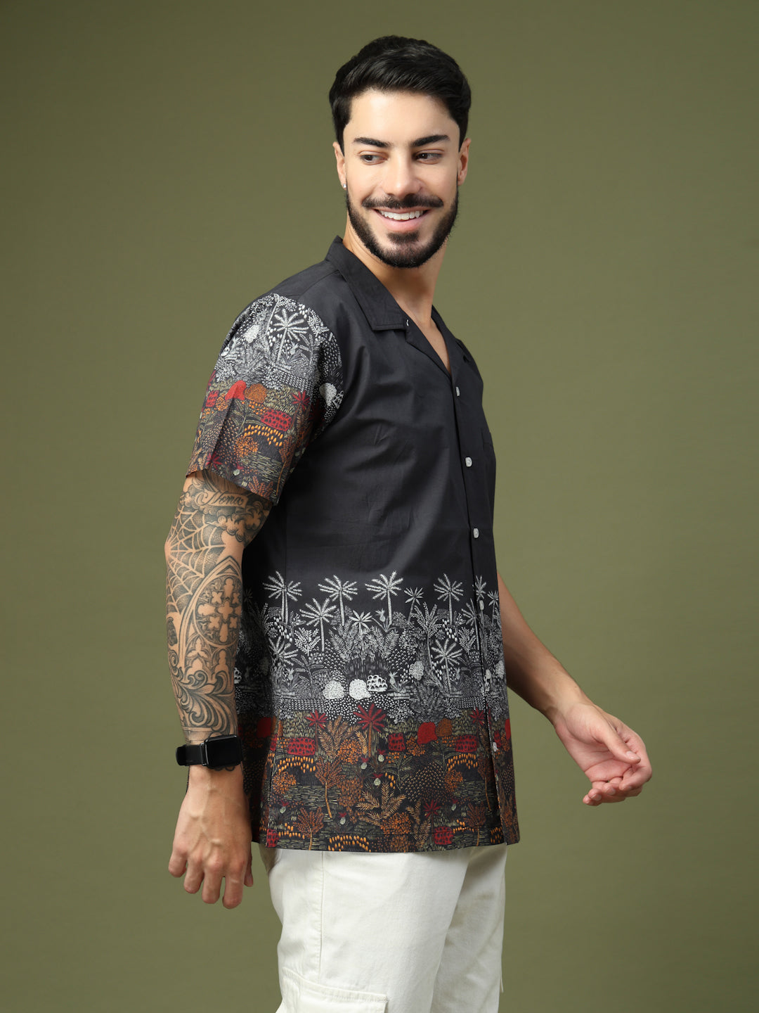 Step up your casual style with this Black Tropical Printed Shirt, designed with a striking blend of earthy hues and detailed palm and foliage motifs. The premium cotton fabric ensures comfort and breathability, while the half sleeves and relaxed fit make it perfect for warm weather. Featuring a button-down front and a stylish spread collar, this shirt is versatile enough for both vacations and weekend outings. Pair it with chinos or shorts for a laid-back yet fashionable look.