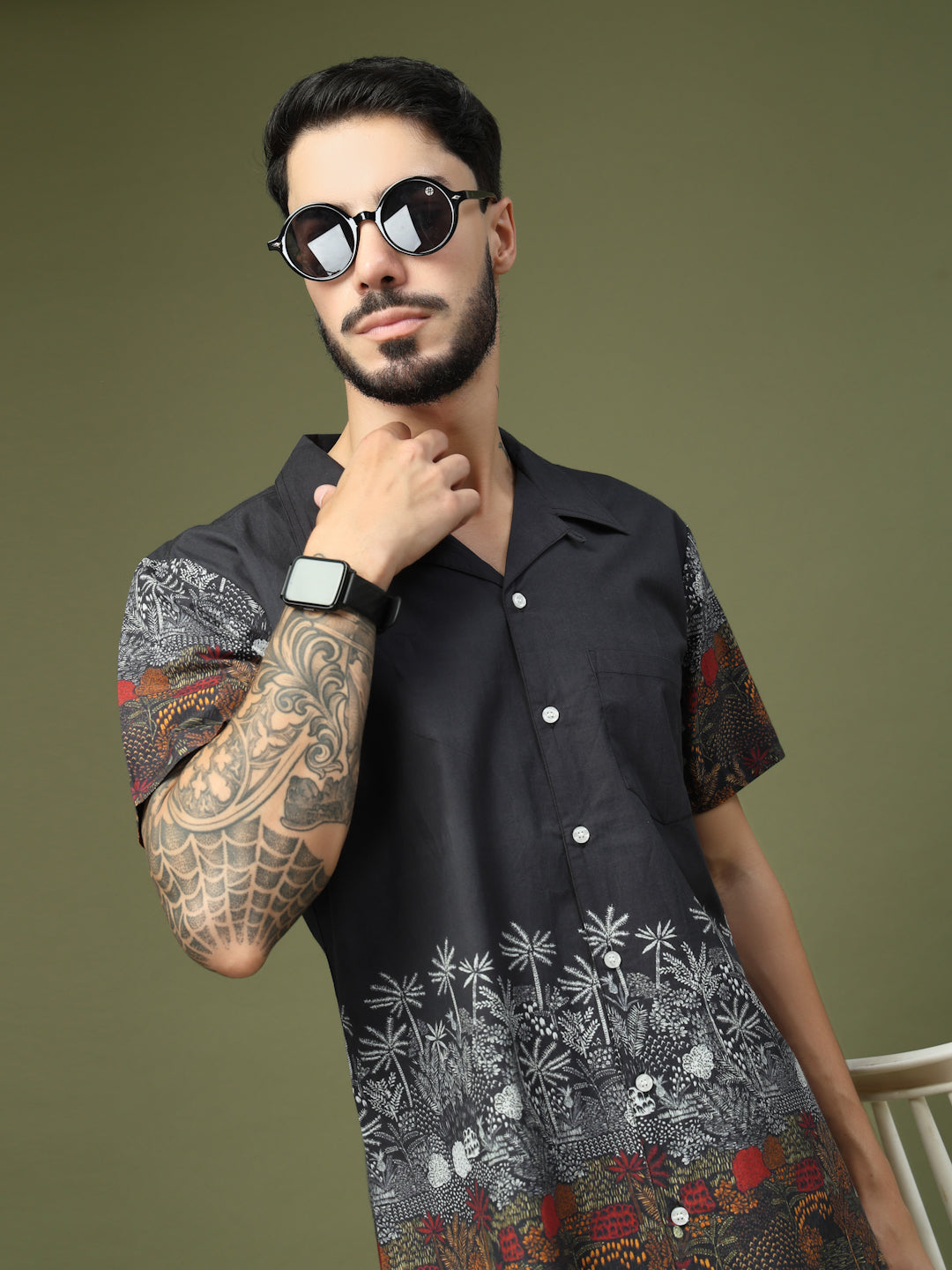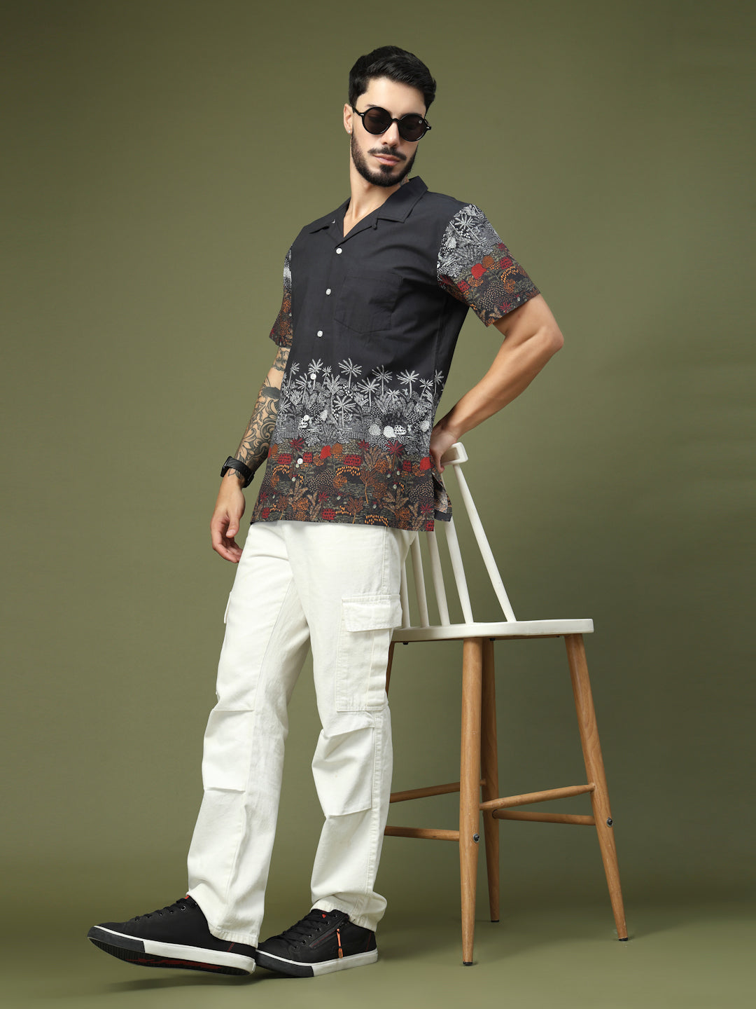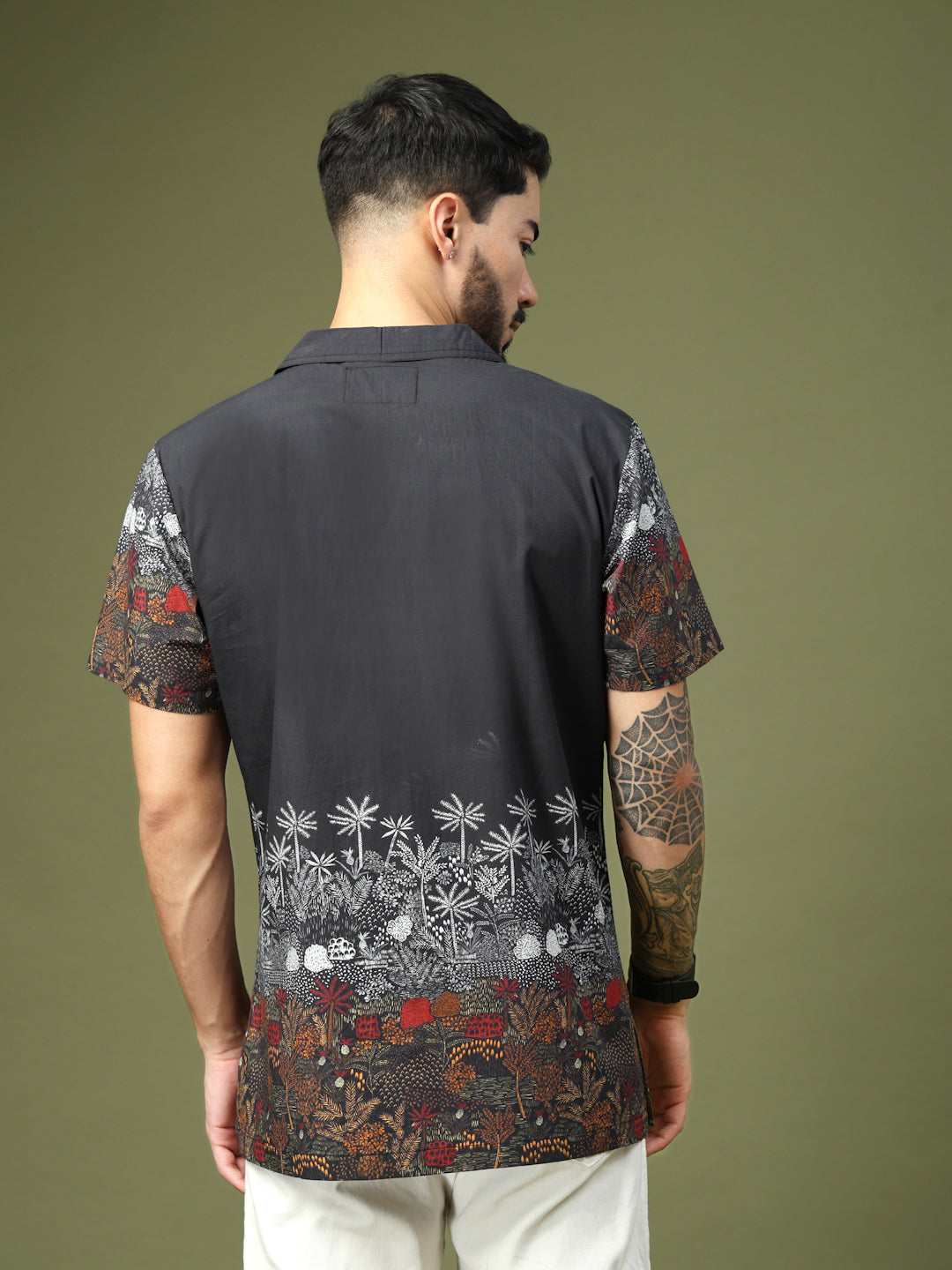 Step up your casual style with this Black Tropical Printed Shirt, designed with a striking blend of earthy hues and detailed palm and foliage motifs. The premium cotton fabric ensures comfort and breathability, while the half sleeves and relaxed fit make it perfect for warm weather. Featuring a button-down front and a stylish spread collar, this shirt is versatile enough for both vacations and weekend outings. Pair it with chinos or shorts for a laid-back yet fashionable look.