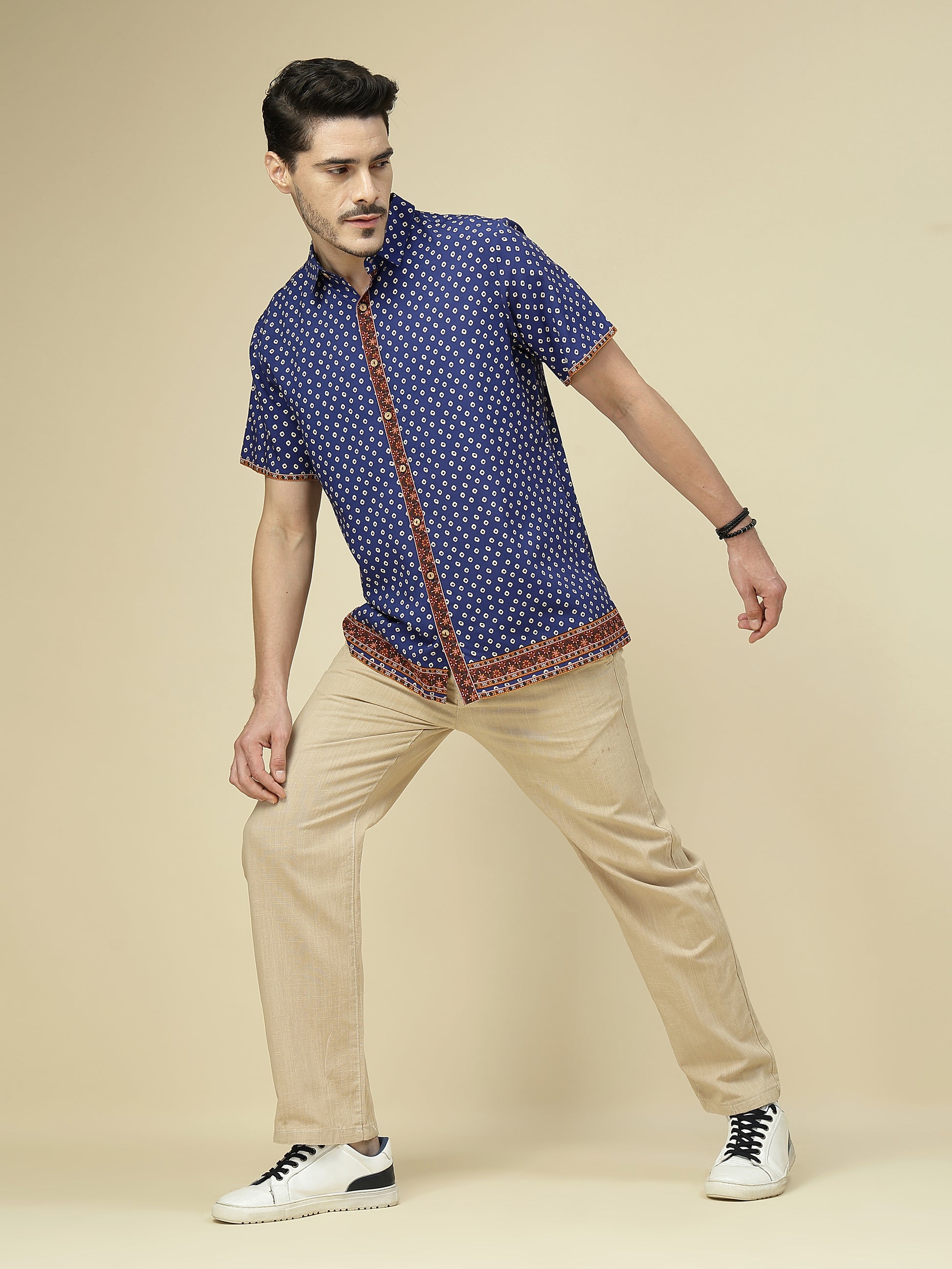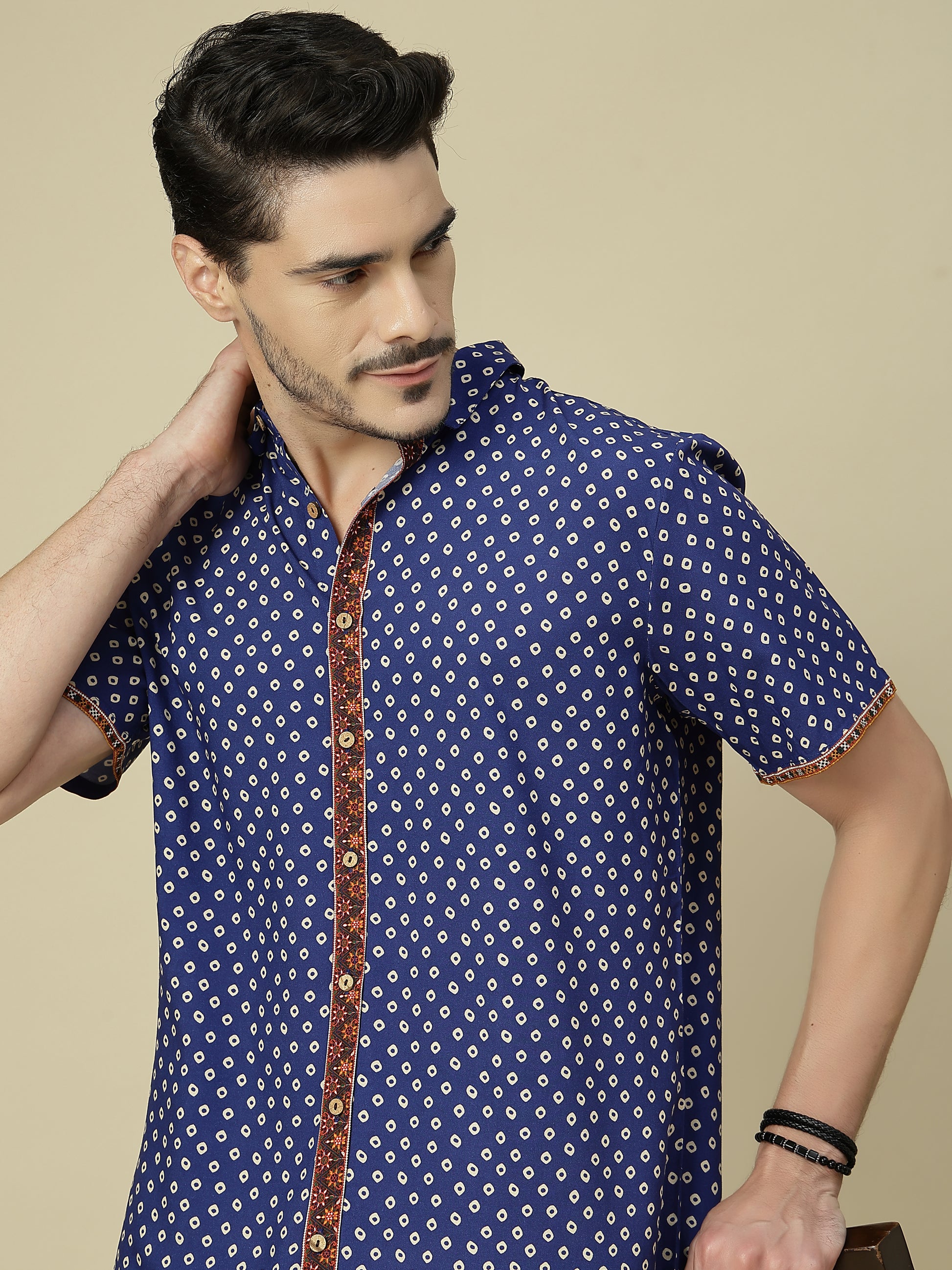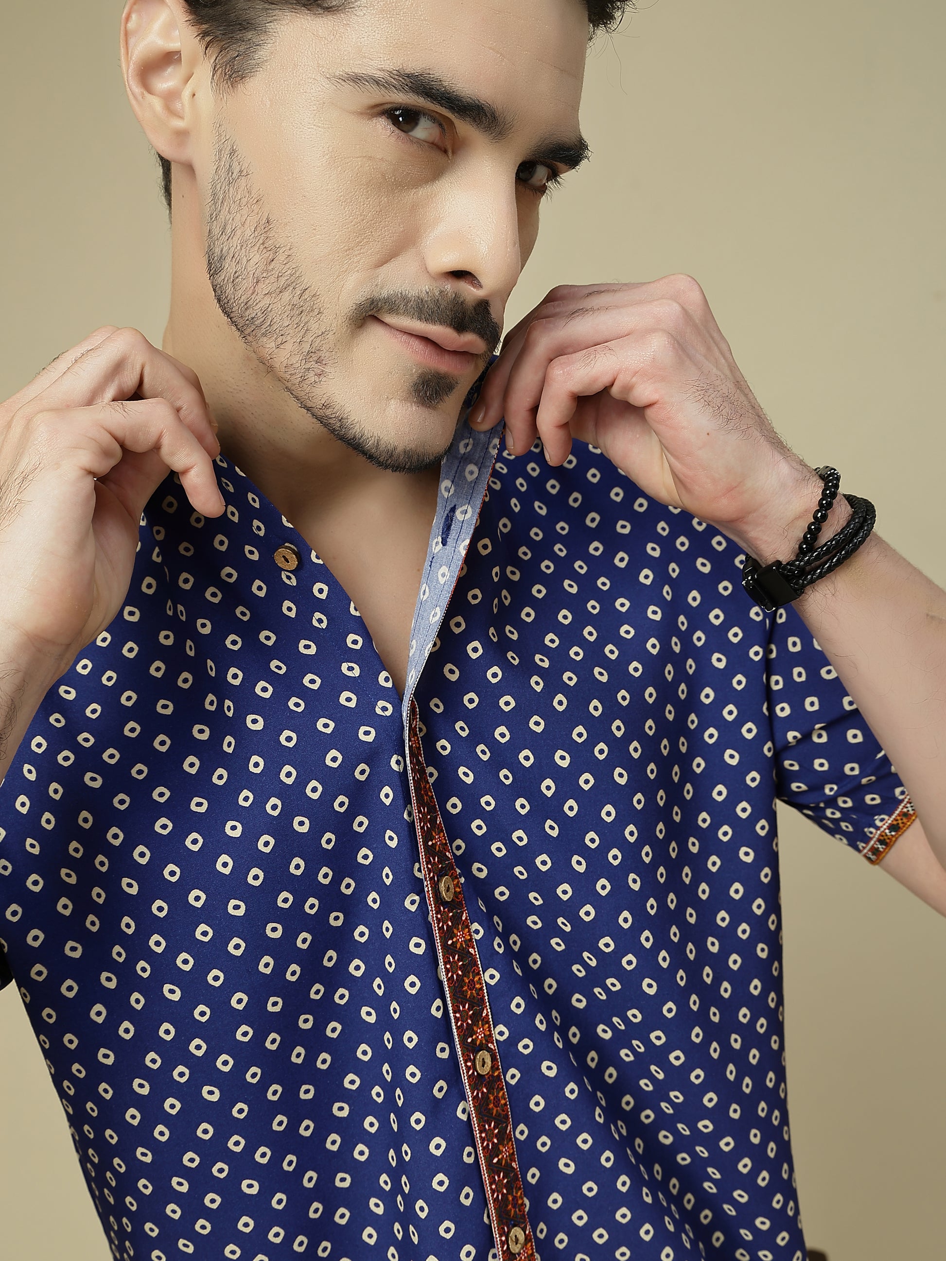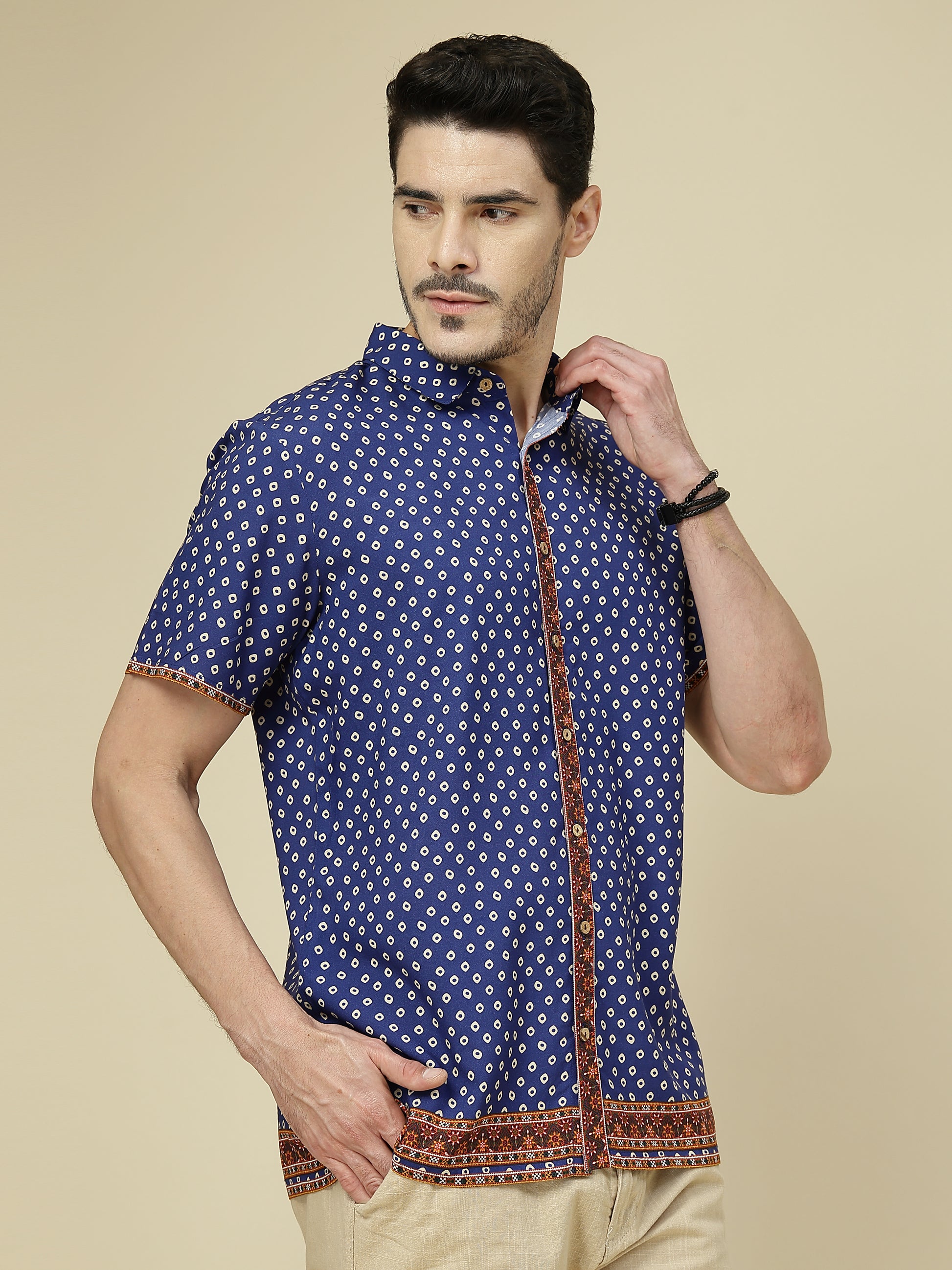 Elevate your casual wardrobe with this stylish Blue short sleeve shirt featuring an all-over geometric dot print. The design is enhanced with a contrasting ethnic-inspired border along the button placket, sleeves, and hemline, adding a touch of traditional charm to a modern silhouette. Crafted from soft, breathable fabric, this shirt ensures all-day comfort while keeping you effortlessly fashionable. Perfect for casual outings, festive gatherings, or laid-back weekend looks, pair it with jeans or chinos to make a bold yet refined statement.