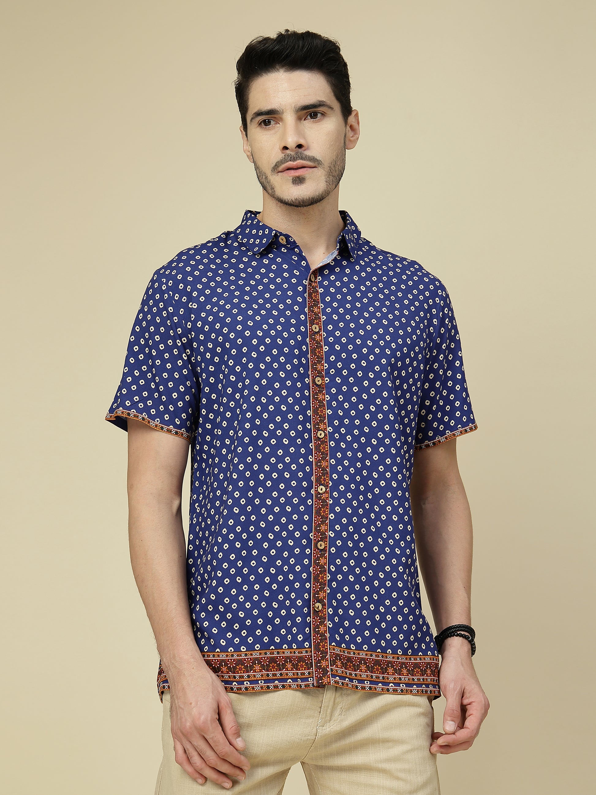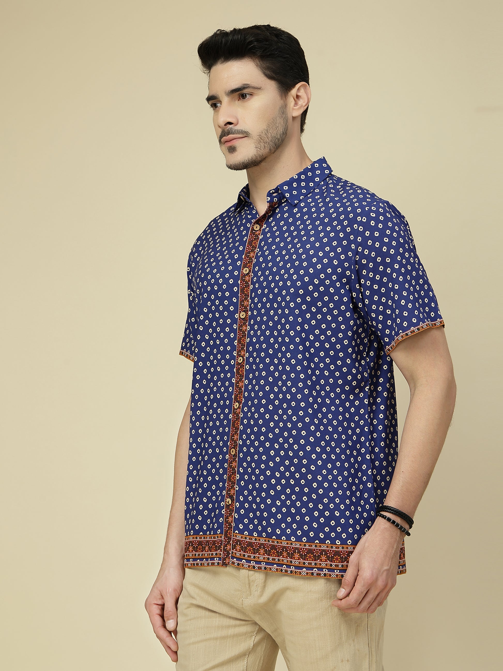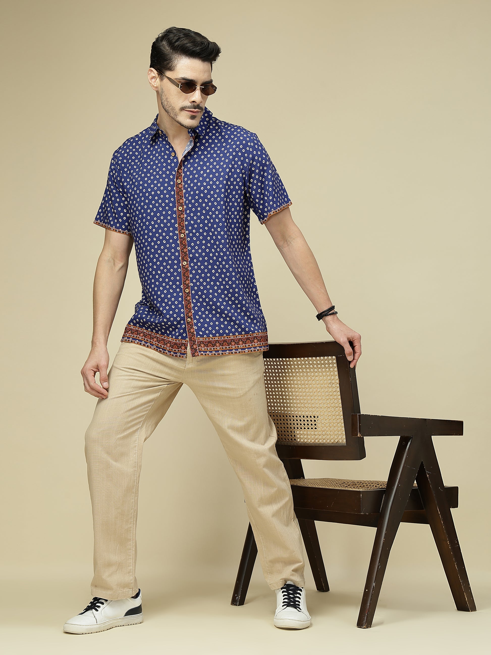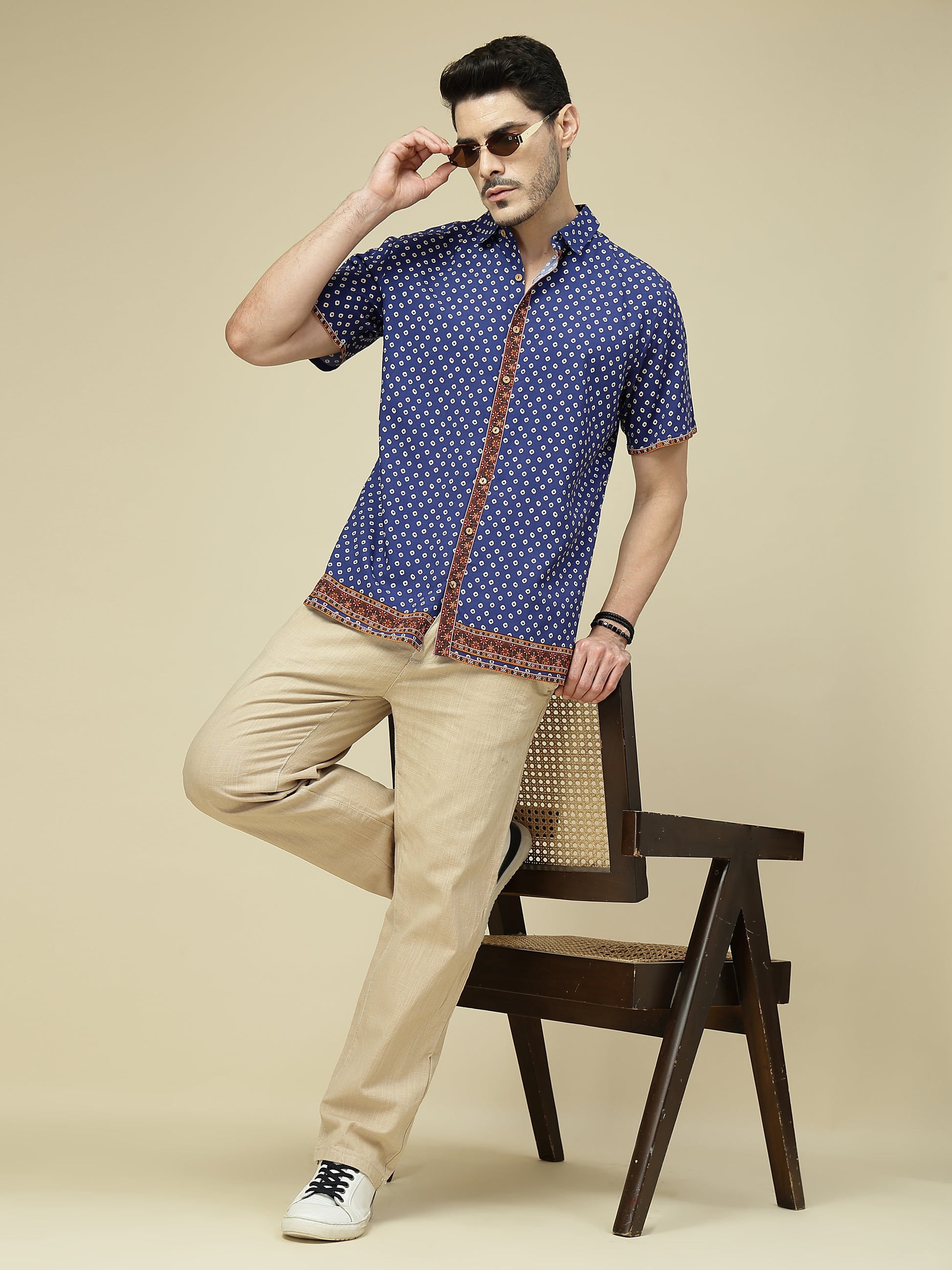 Elevate your casual wardrobe with this stylish Blue short sleeve shirt featuring an all-over geometric dot print. The design is enhanced with a contrasting ethnic-inspired border along the button placket, sleeves, and hemline, adding a touch of traditional charm to a modern silhouette. Crafted from soft, breathable fabric, this shirt ensures all-day comfort while keeping you effortlessly fashionable. Perfect for casual outings, festive gatherings, or laid-back weekend looks, pair it with jeans or chinos to make a bold yet refined statement.