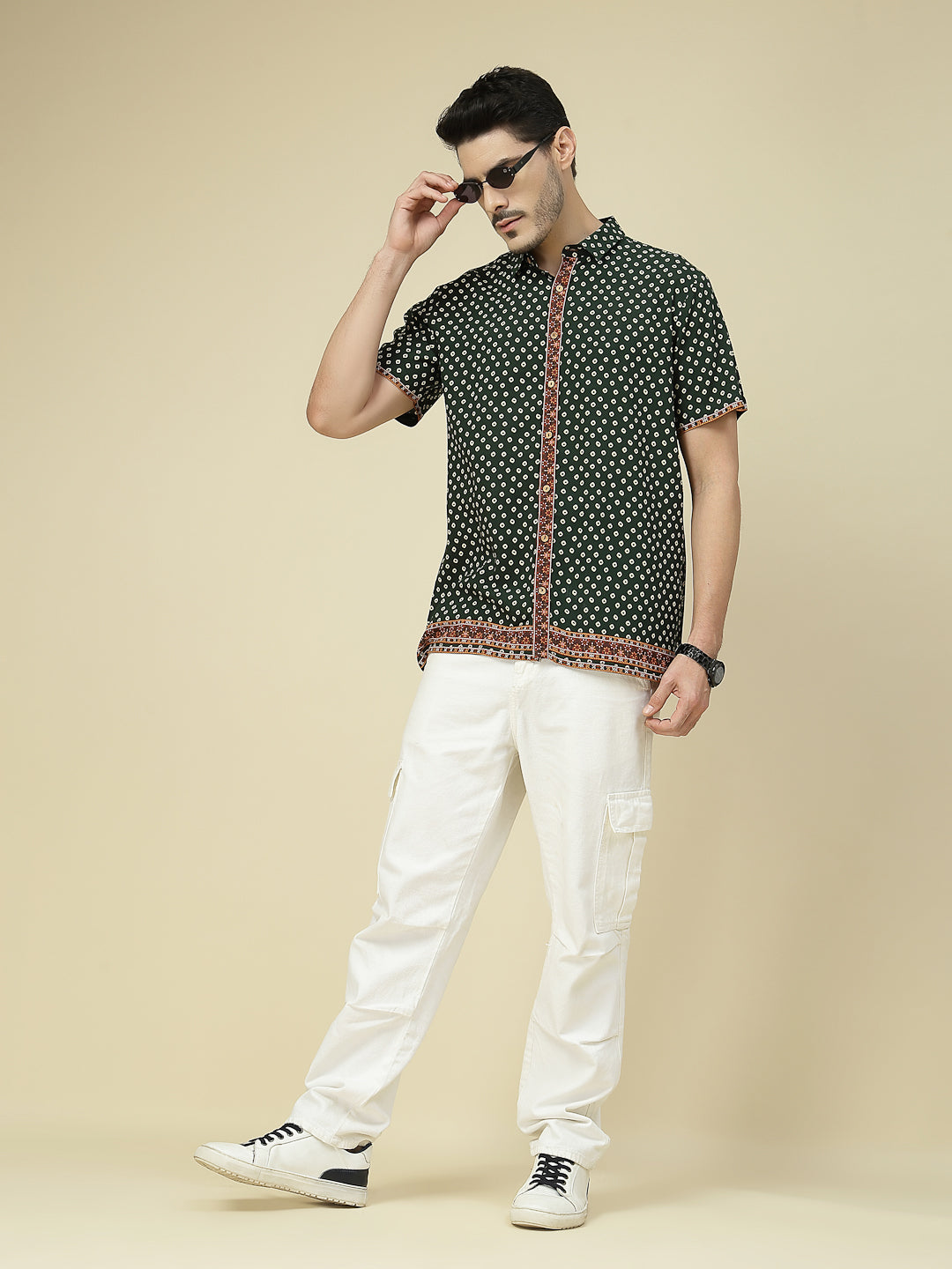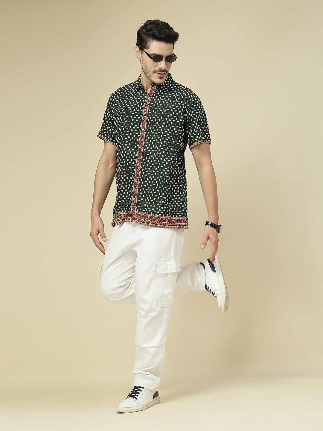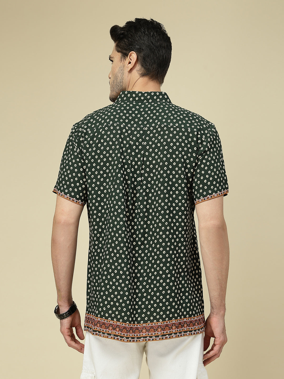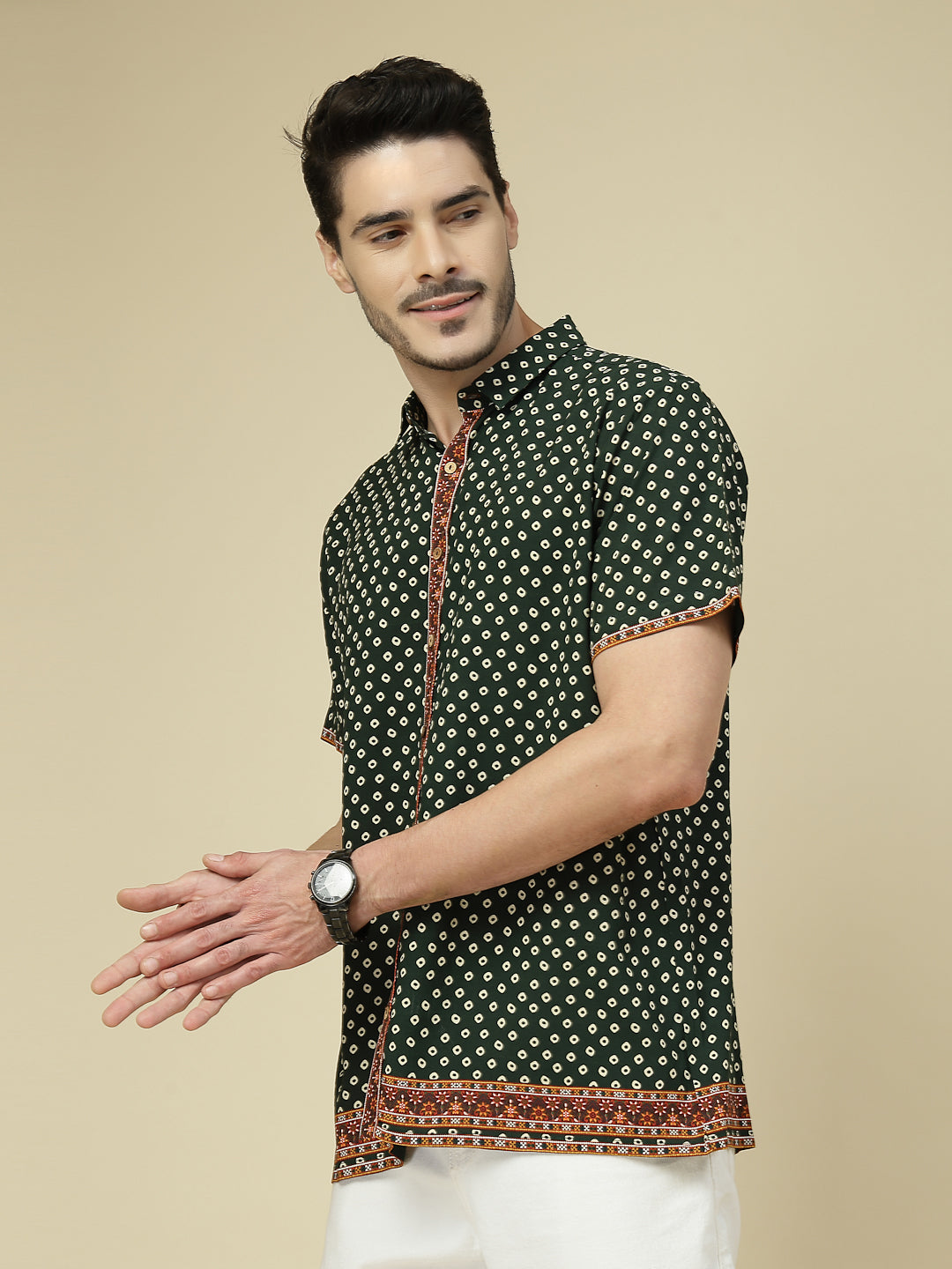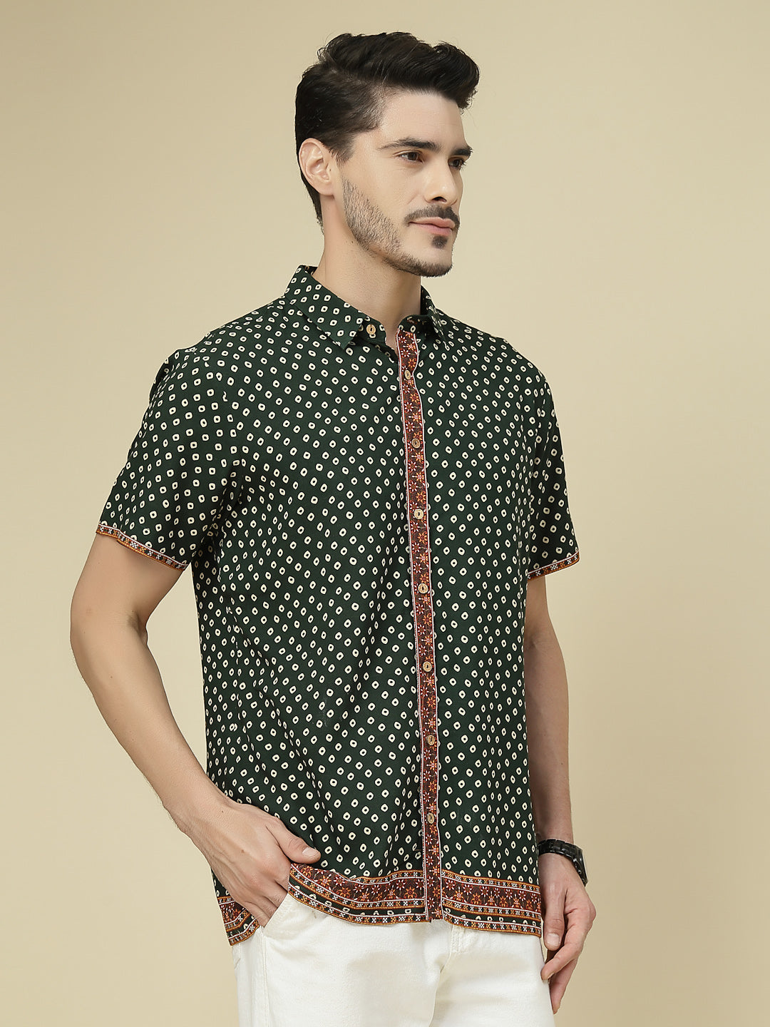 Elevate your casual wardrobe with this stylish green short sleeve shirt featuring an all-over geometric dot print. The design is enhanced with a contrasting ethnic-inspired border along the button placket, sleeves, and hemline, adding a touch of traditional charm to a modern silhouette. Crafted from soft, breathable fabric, this shirt ensures all-day comfort while keeping you effortlessly fashionable. Perfect for casual outings, festive gatherings, or laid-back weekend looks, pair it with jeans or chinos to make a bold yet refined statement.