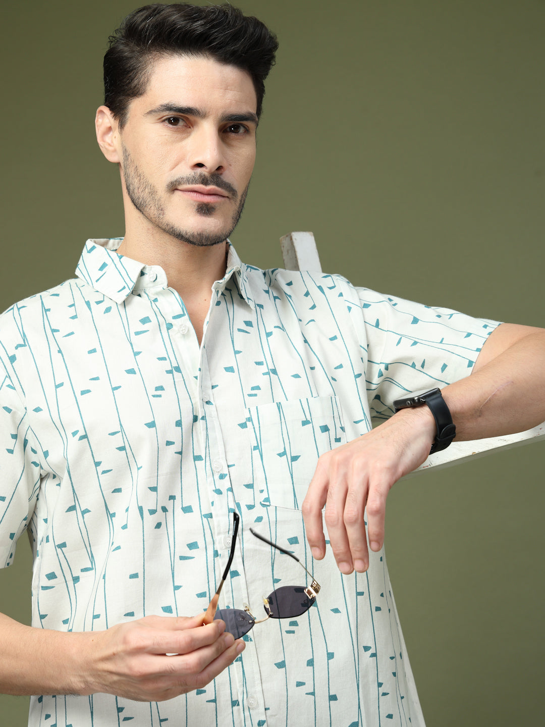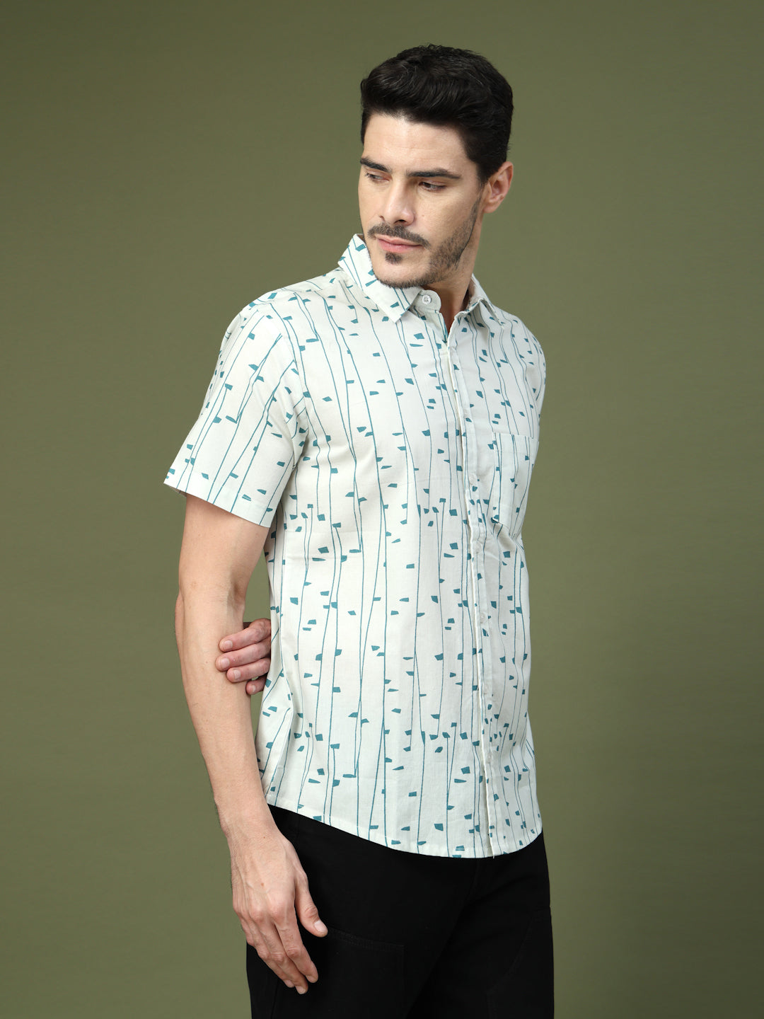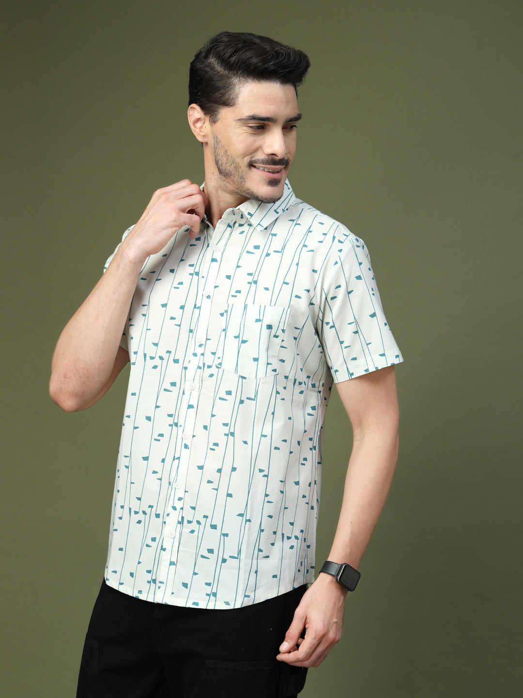 Stay sharp and comfortable with this Minimal Geometric Printed Short Sleeve Shirt, designed for modern casual dressing. The subtle off-white base is highlighted with teal geometric line patterns, adding a clean yet stylish edge to your everyday look.