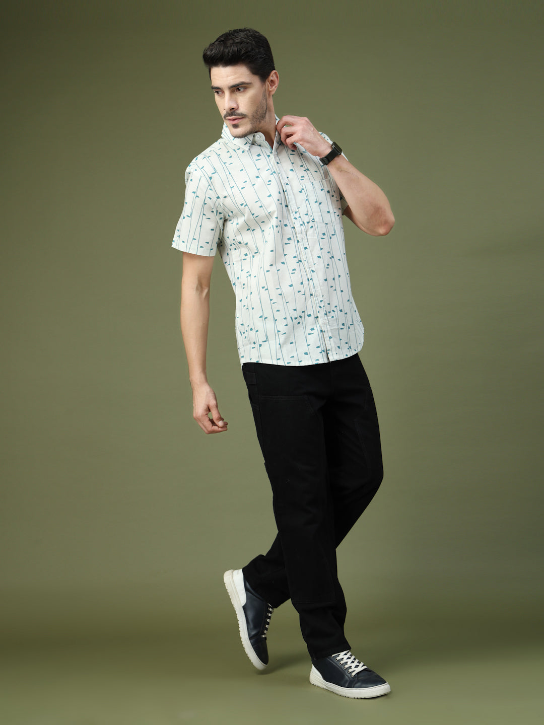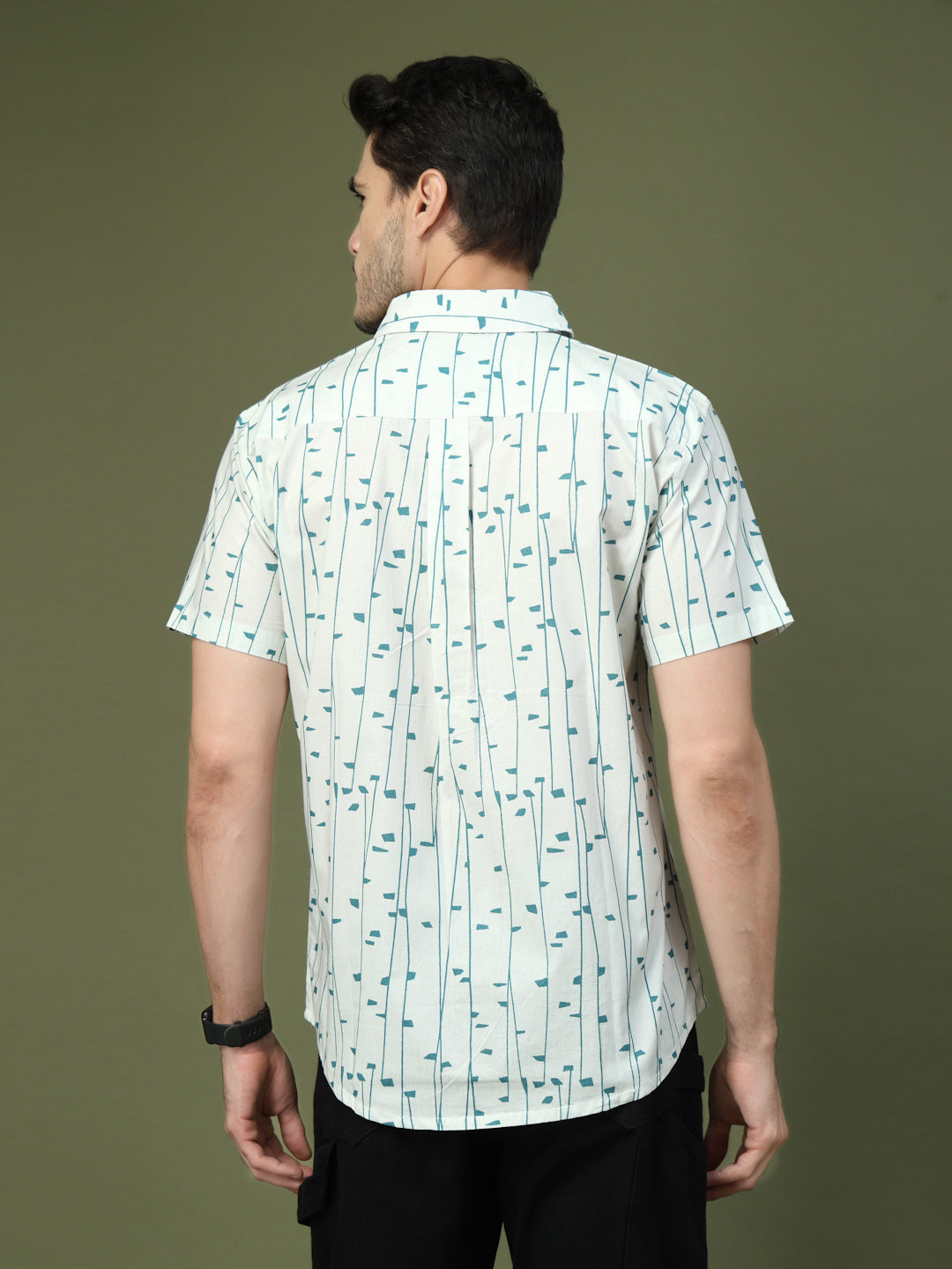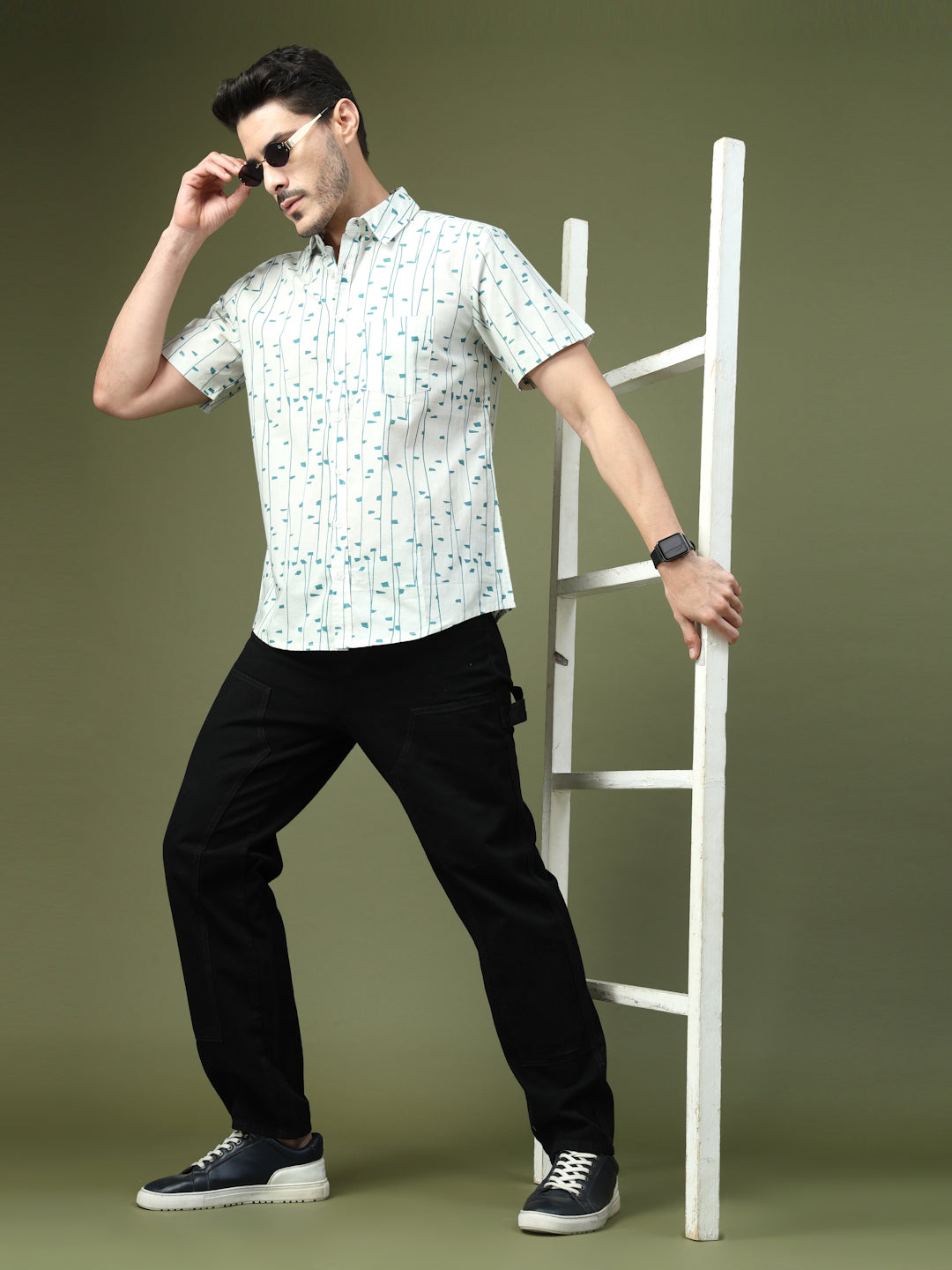 Stay sharp and comfortable with this Minimal Geometric Printed Short Sleeve Shirt, designed for modern casual dressing. The subtle off-white base is highlighted with teal geometric line patterns, adding a clean yet stylish edge to your everyday look.