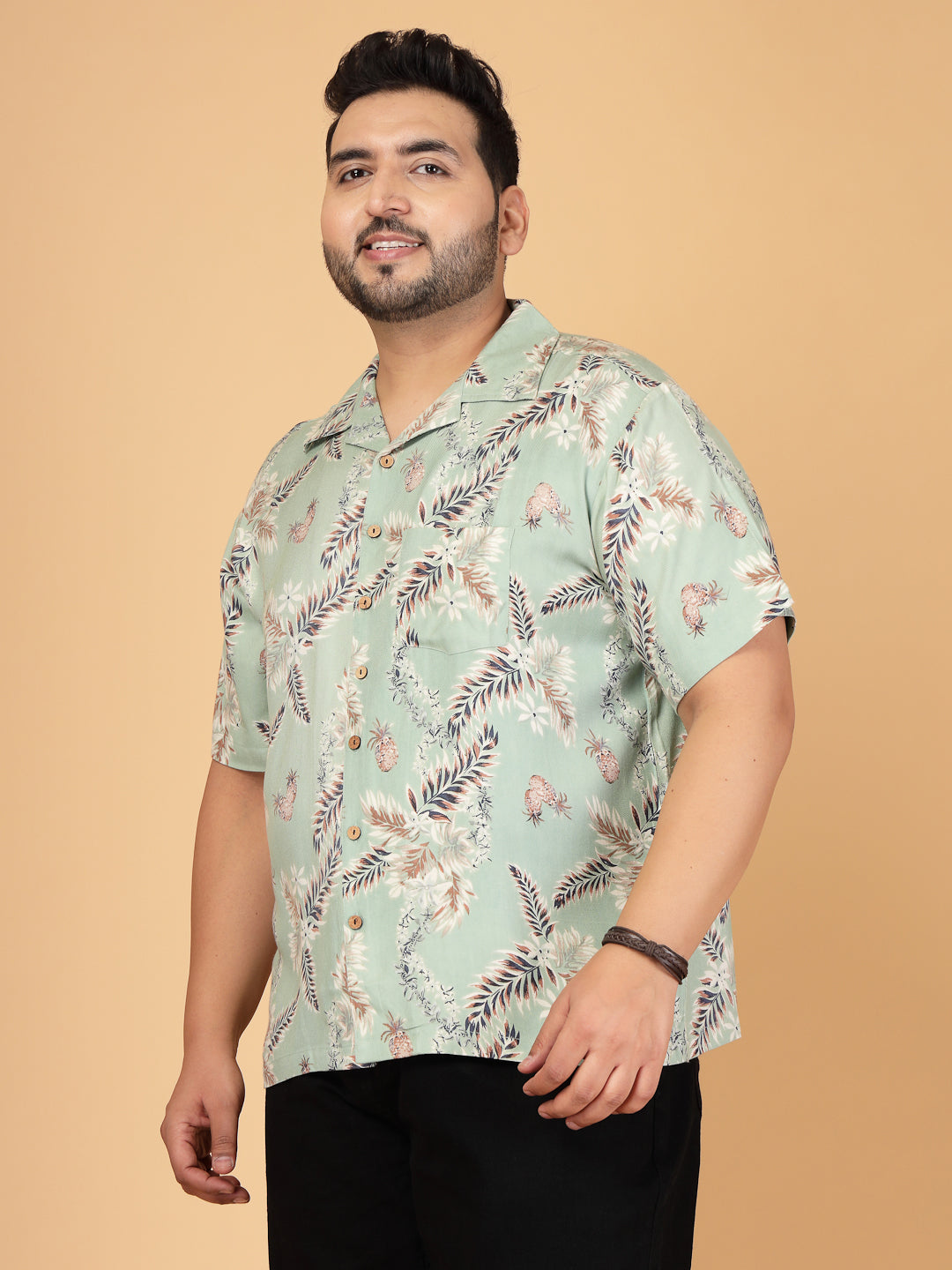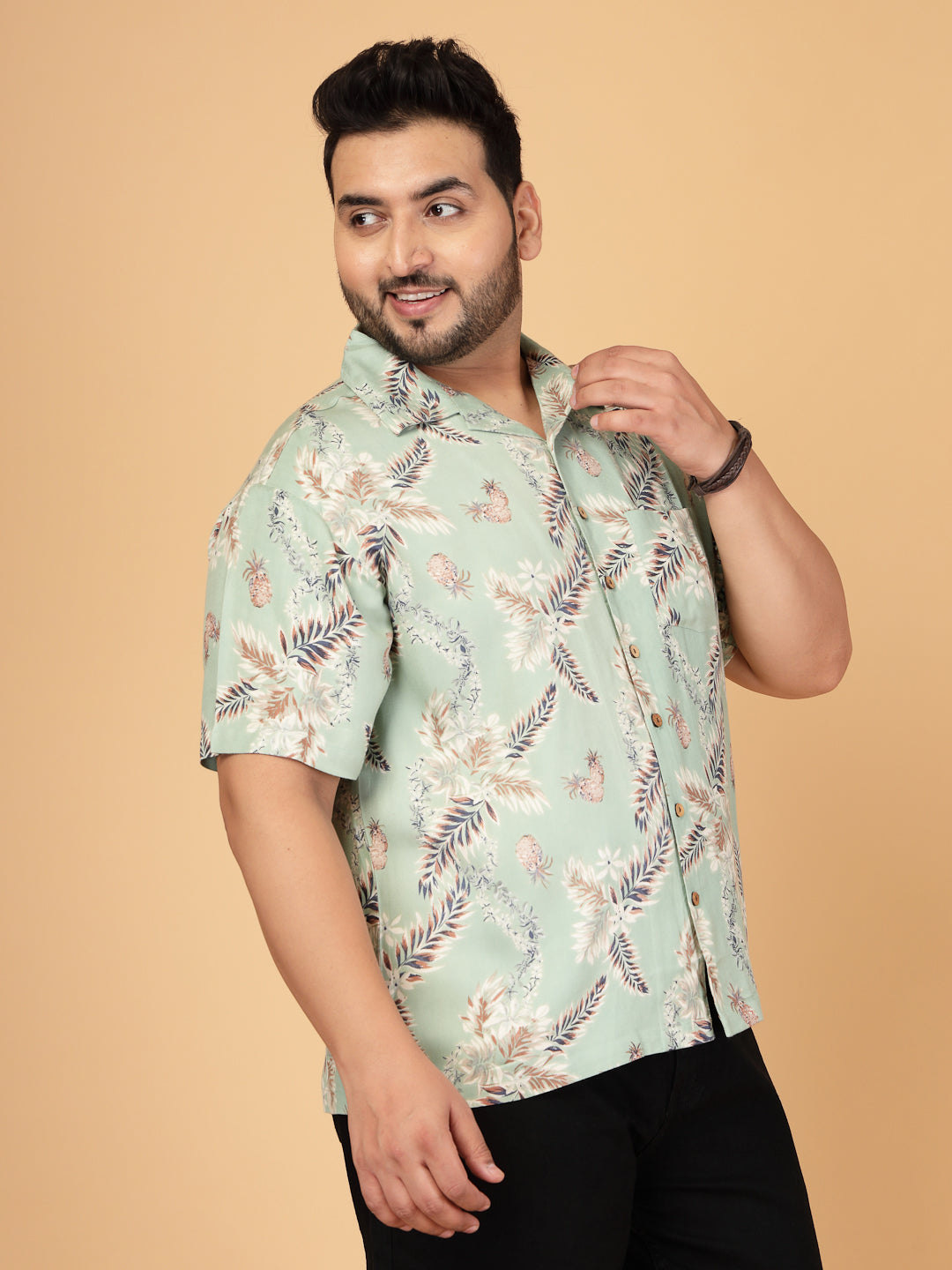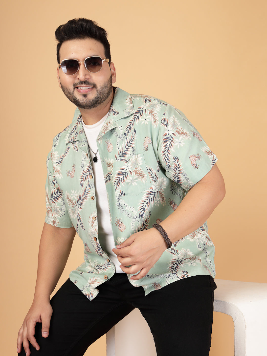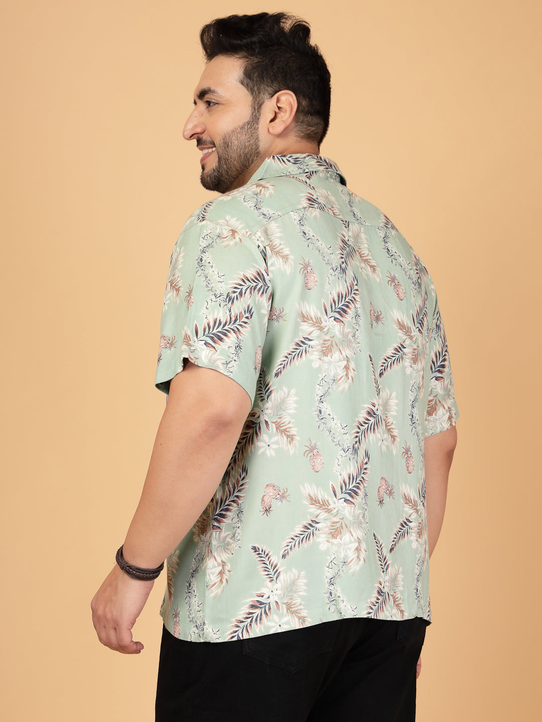 Refresh your wardrobe with effortless vacation vibes in this Mint Green Tropical Leaf Print Shirt, crafted from premium rayon twill fabric for a soft, breathable feel. Featuring a relaxed fit and a breezy spread collar, this shirt brings together comfort and style in perfect harmony. The all-over tropical leaf and pineapple print in subtle earthy tones pops beautifully against the mint green base, making it a standout choice for beach getaways, summer outings, or casual weekend plans.