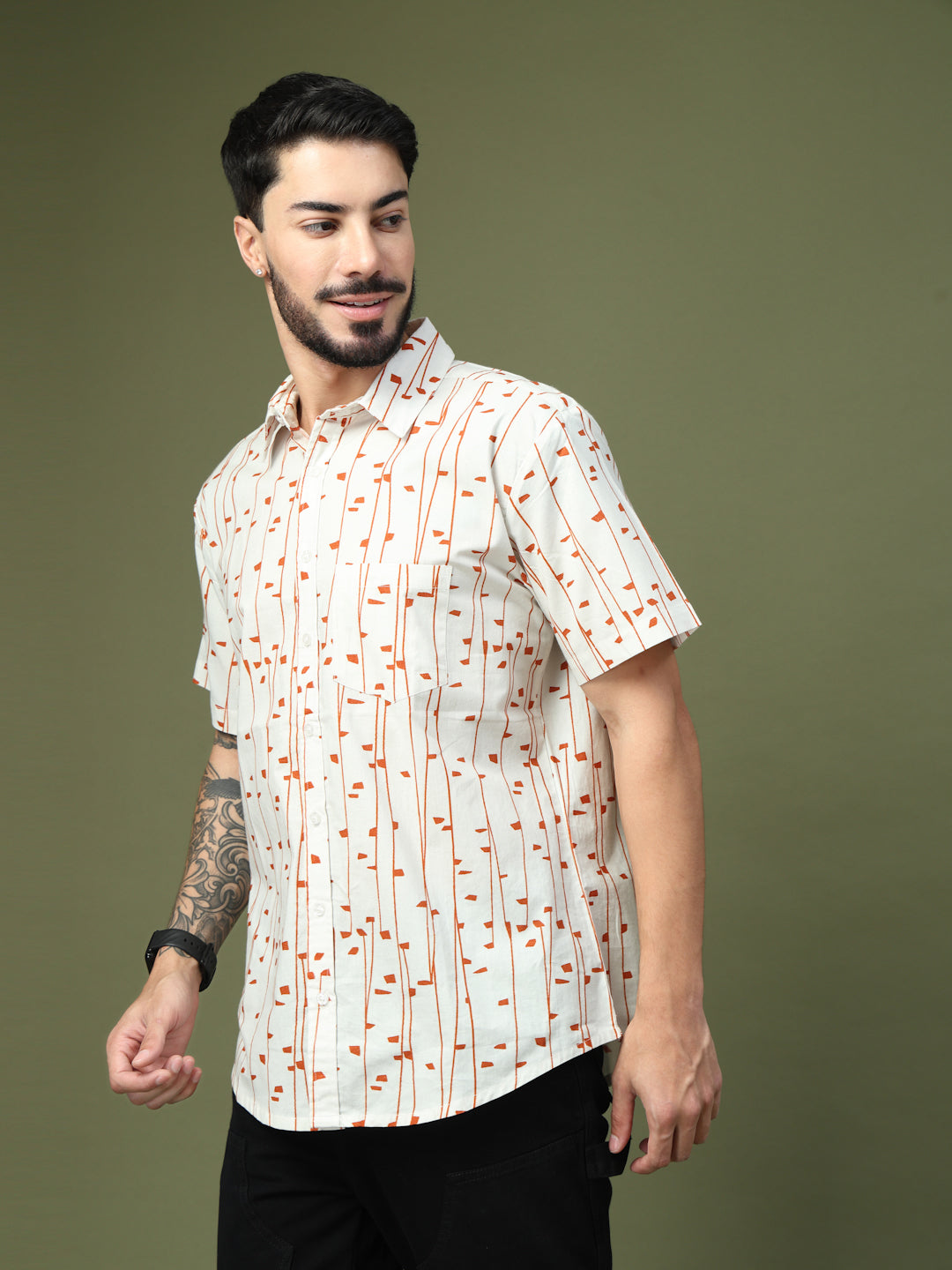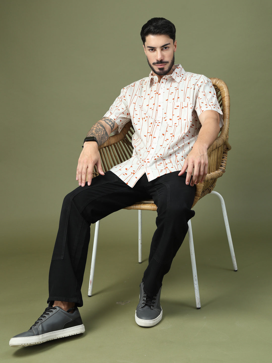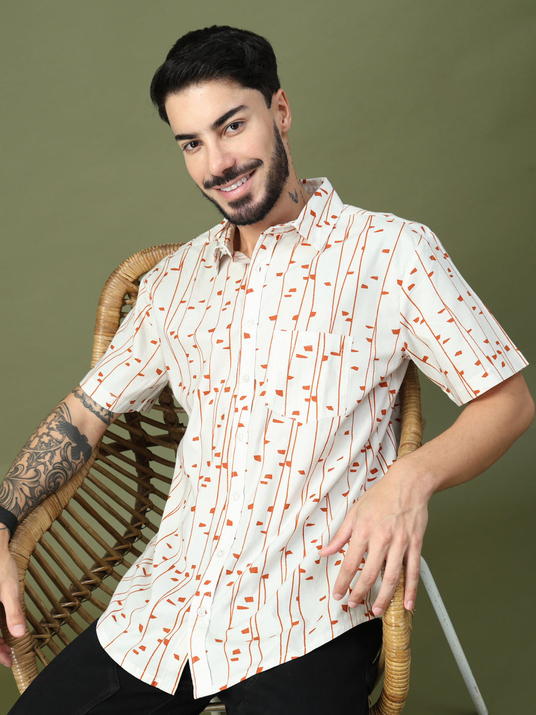 Elevate your casual wardrobe with this off-white geometric printed shirt, crafted from Pure Cotton for unmatched comfort and a premium drape. The modern rust-orange linear and block print design gives this shirt a contemporary edge, making it versatile for both casual outings and smart-casual occasions. Lightweight, breathable, and soft against the skin, it offers a relaxed fit with short sleeves and a button-down front. Pair it effortlessly with denims, chinos, or shorts for a polished yet easy-going look.