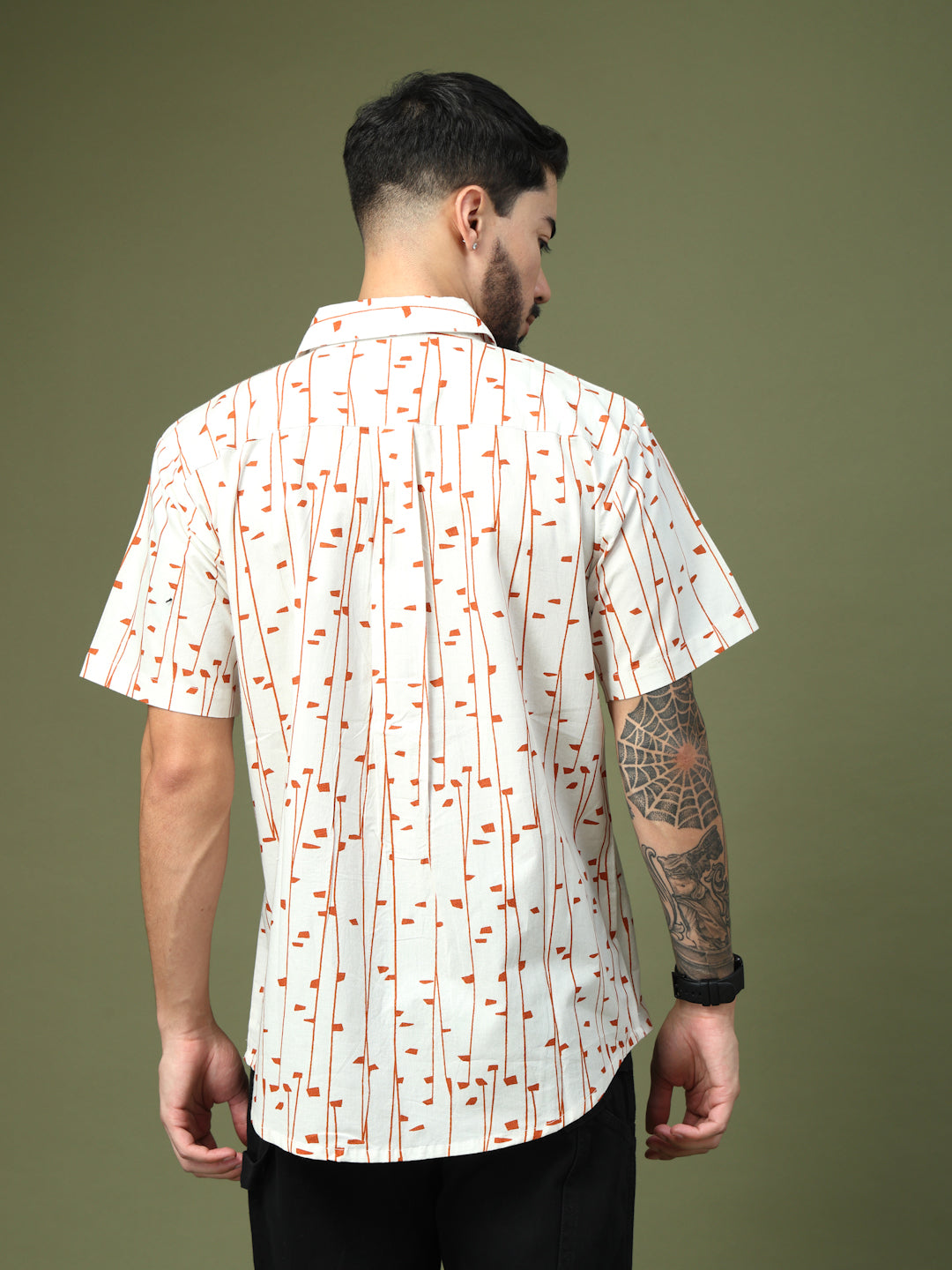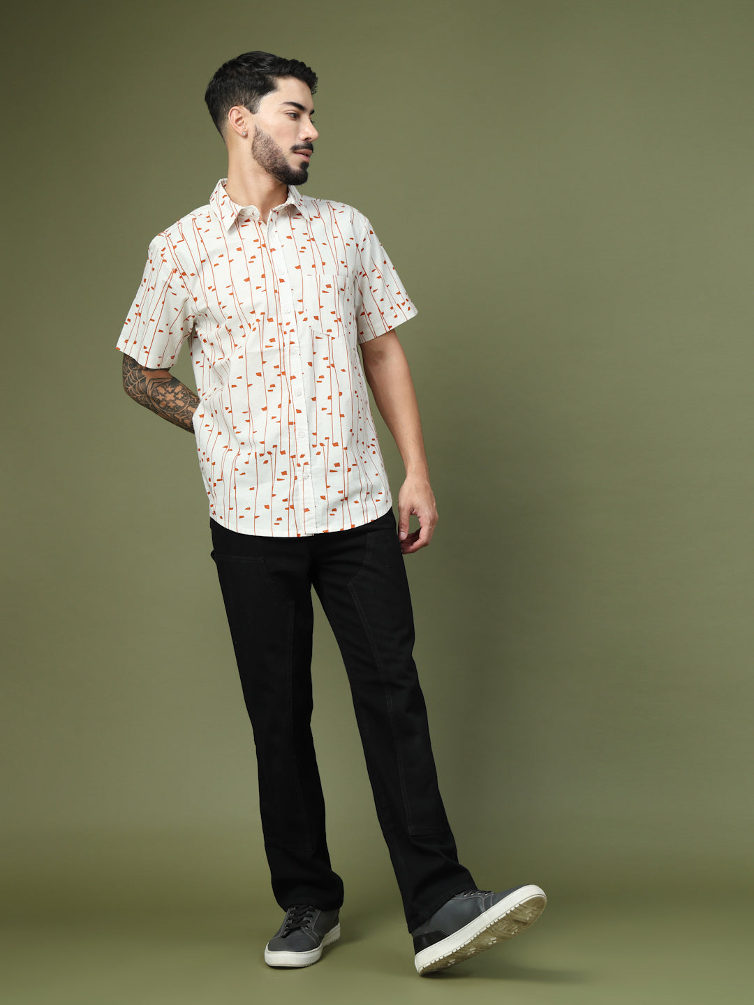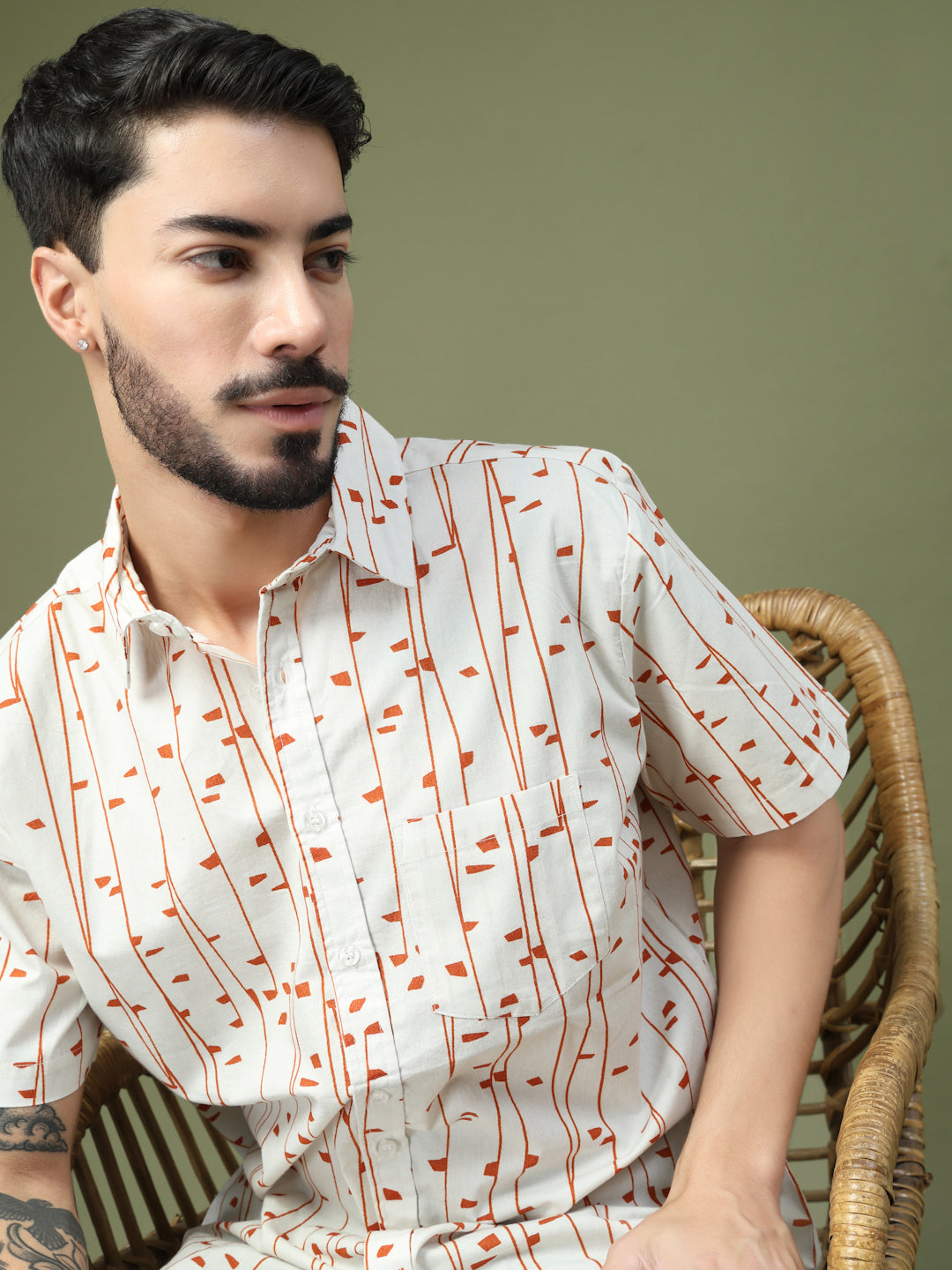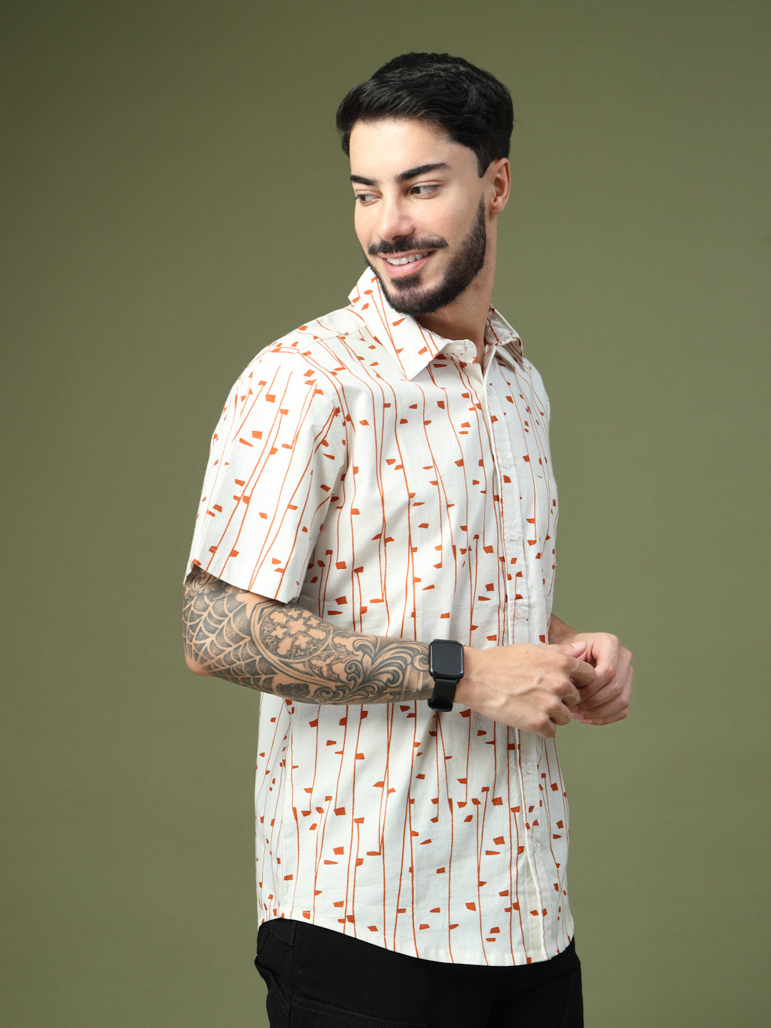 Elevate your casual wardrobe with this off-white geometric printed shirt, crafted from Pure Cotton for unmatched comfort and a premium drape. The modern rust-orange linear and block print design gives this shirt a contemporary edge, making it versatile for both casual outings and smart-casual occasions. Lightweight, breathable, and soft against the skin, it offers a relaxed fit with short sleeves and a button-down front. Pair it effortlessly with denims, chinos, or shorts for a polished yet easy-going look.