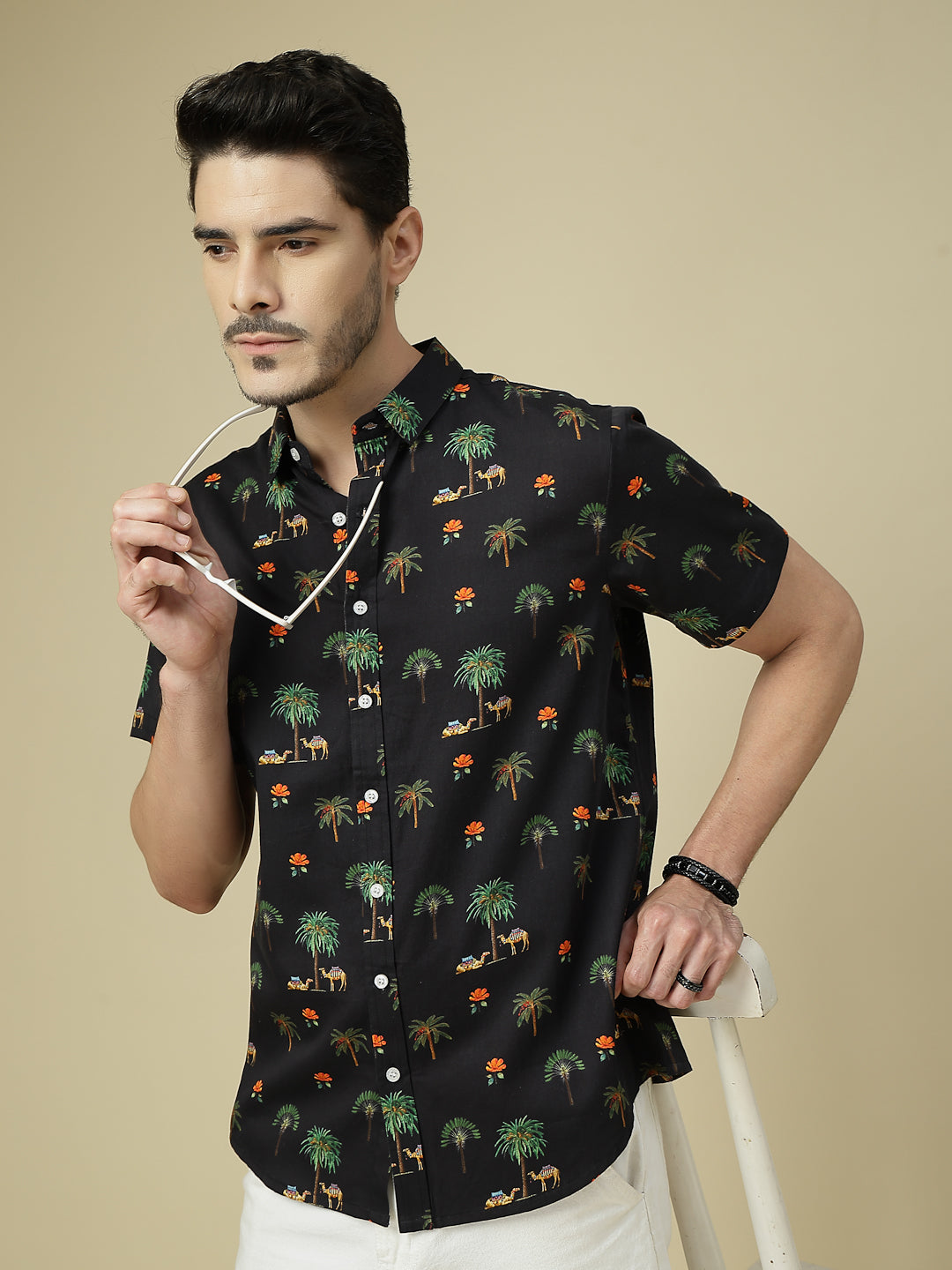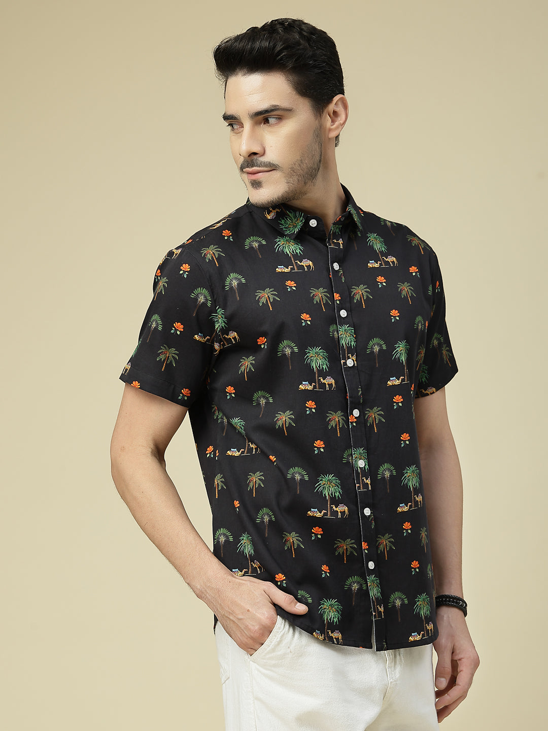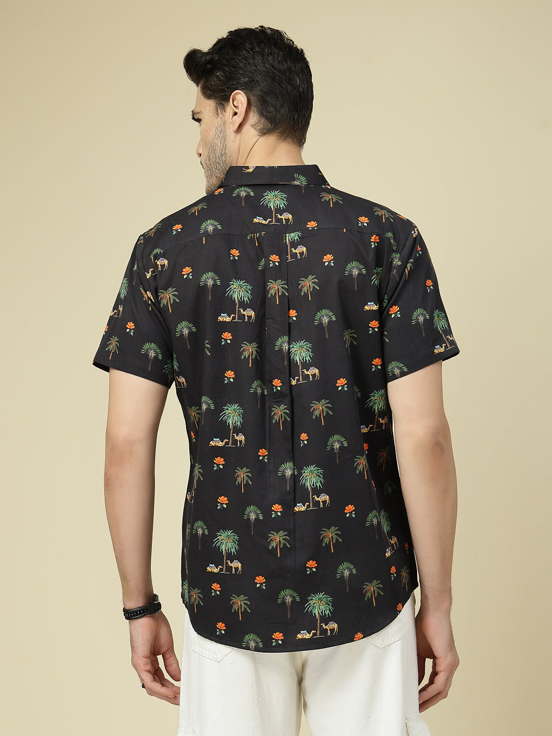 Add a touch of wanderlust to your wardrobe with this tropical-inspired shirt featuring palm trees, camels, and vibrant floral motifs on a deep black base. Crafted in breathable cotton, it’s perfect for vacations, beach outings, or casual weekends. Pair it with white chinos or denim for a cool, breezy look that never goes out of style.