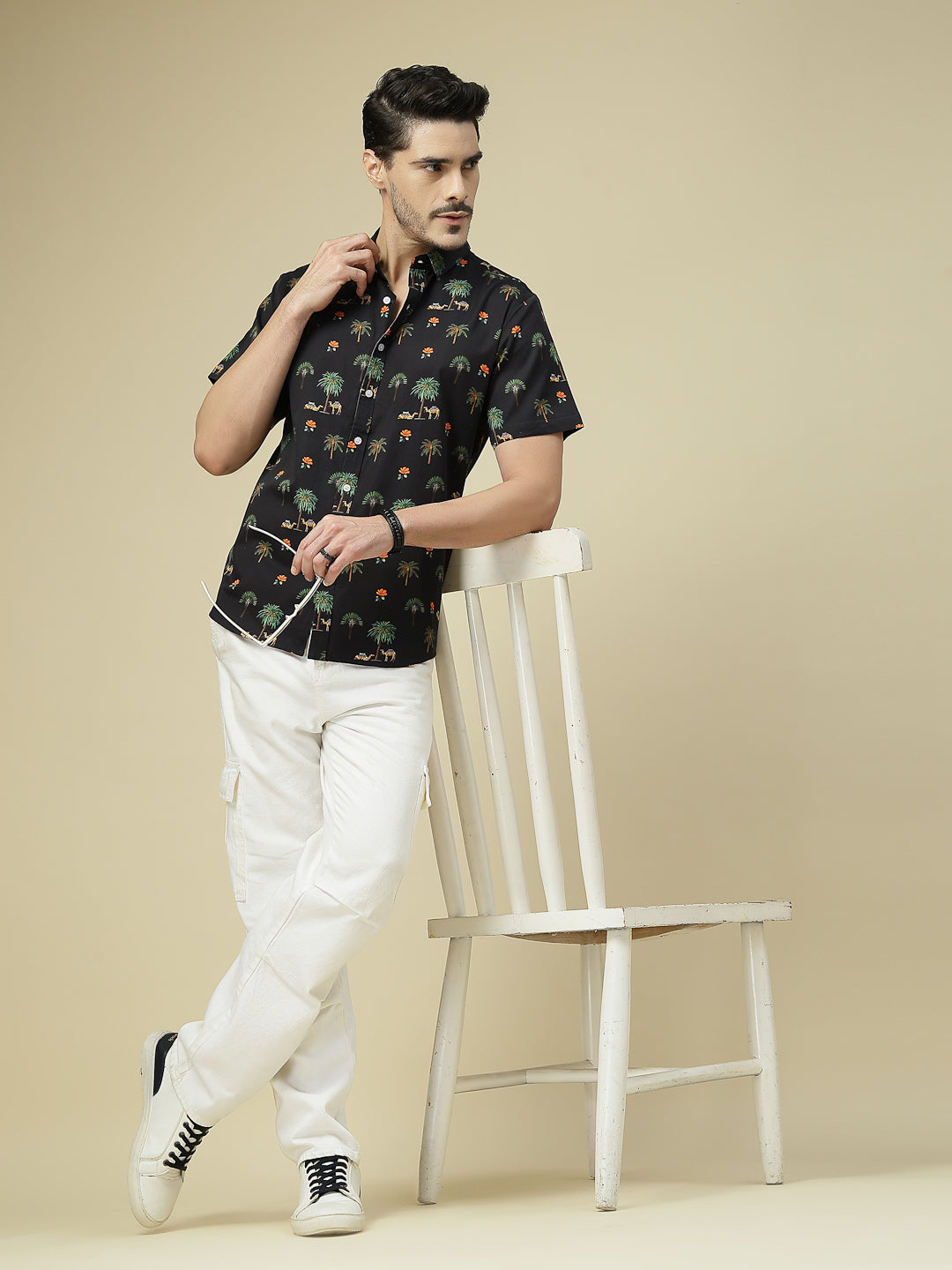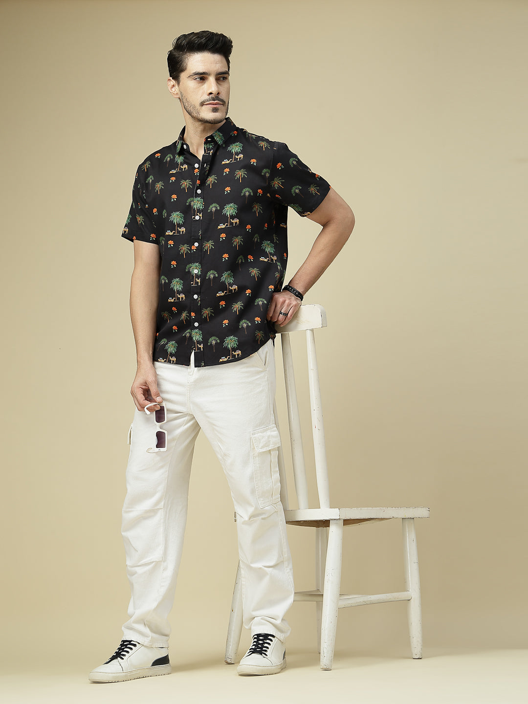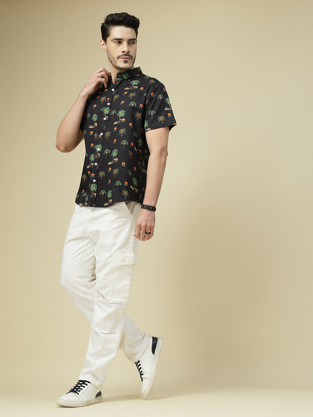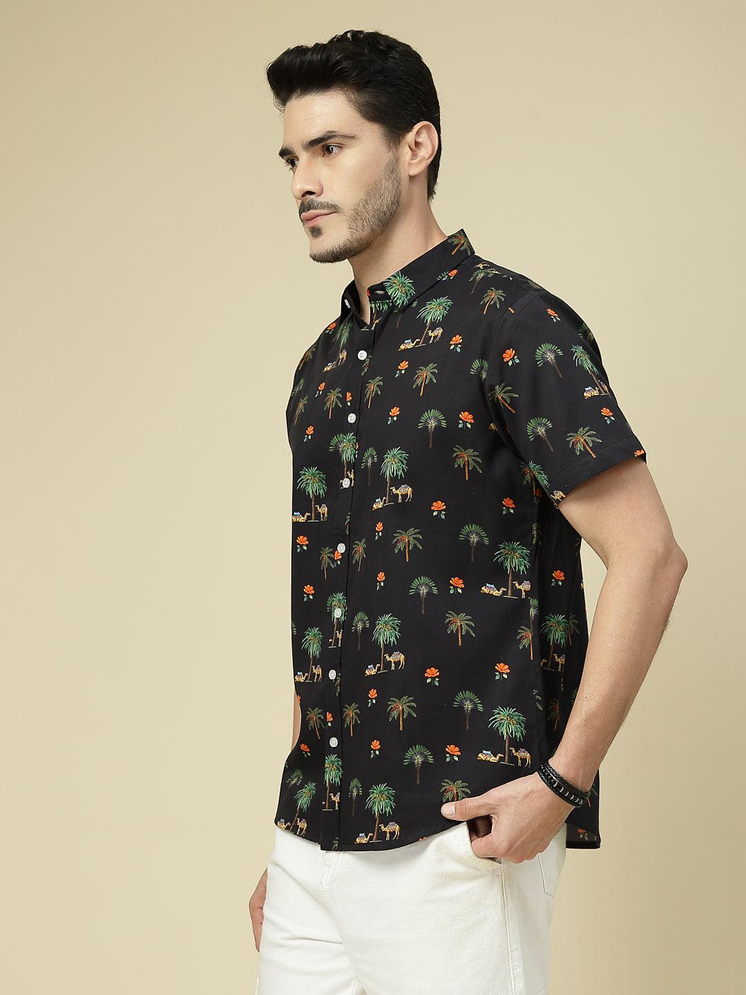 Add a touch of wanderlust to your wardrobe with this tropical-inspired shirt featuring palm trees, camels, and vibrant floral motifs on a deep black base. Crafted in breathable cotton, it’s perfect for vacations, beach outings, or casual weekends. Pair it with white chinos or denim for a cool, breezy look that never goes out of style.
