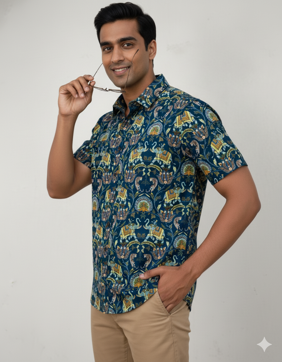 Elevate your everyday style with this heritage-inspired printed shirt, designed for men who appreciate detail and comfort. Crafted from breathable, lightweight fabric, this shirt features an intricate all-over print in rich indigo tones, making it perfect for both casual outings and relaxed evenings. A refined silhouette and premium stitching ensure a sharp look that lasts all day. Whether paired with chinos or denim, this shirt brings effortless sophistication to your wardrobe.