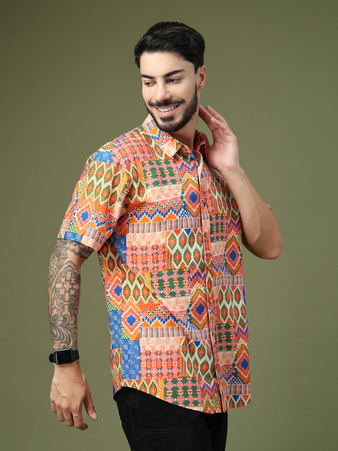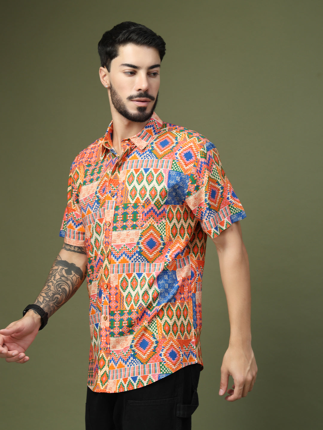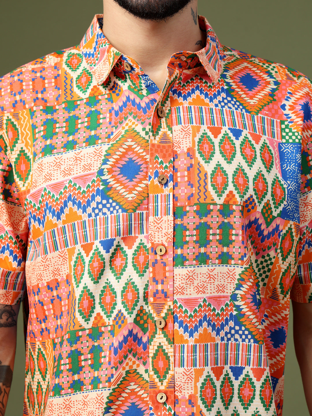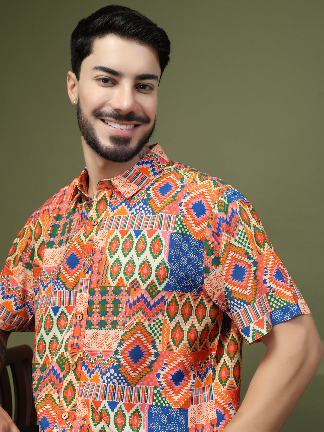 Step into the spotlight with this Vibrant Geometric Patchwork Printed Shirt, crafted from premium Pure Cotton for unmatched comfort and breathability. Featuring a bold fusion of intricate geometric motifs and ethnic-inspired patterns, this short-sleeve shirt brings a lively, festive vibe to any look. Perfect for casual outings, festive celebrations, or vacation getaways, it’s designed to make a statement while keeping you effortlessly stylish and comfortable all day long.