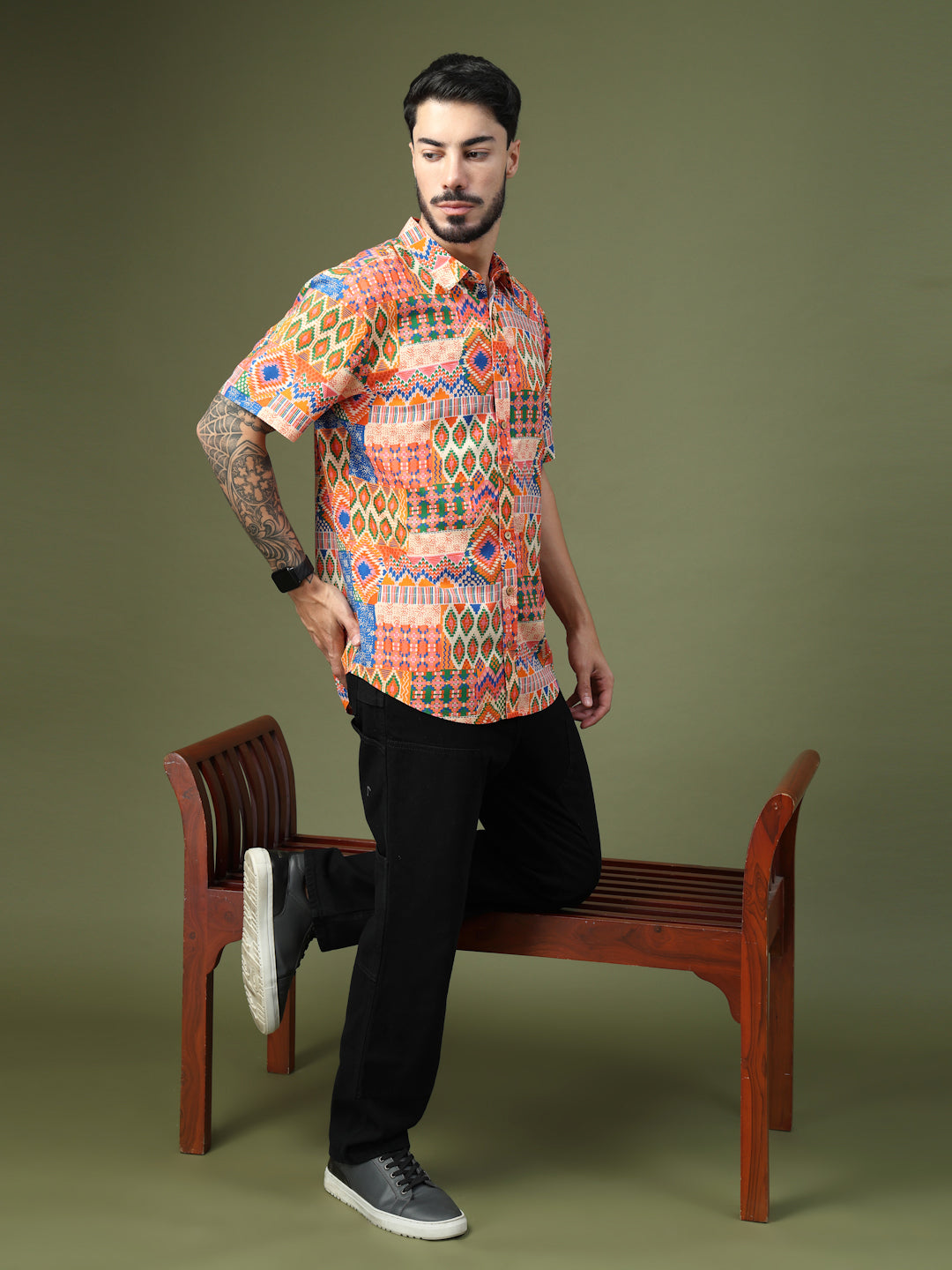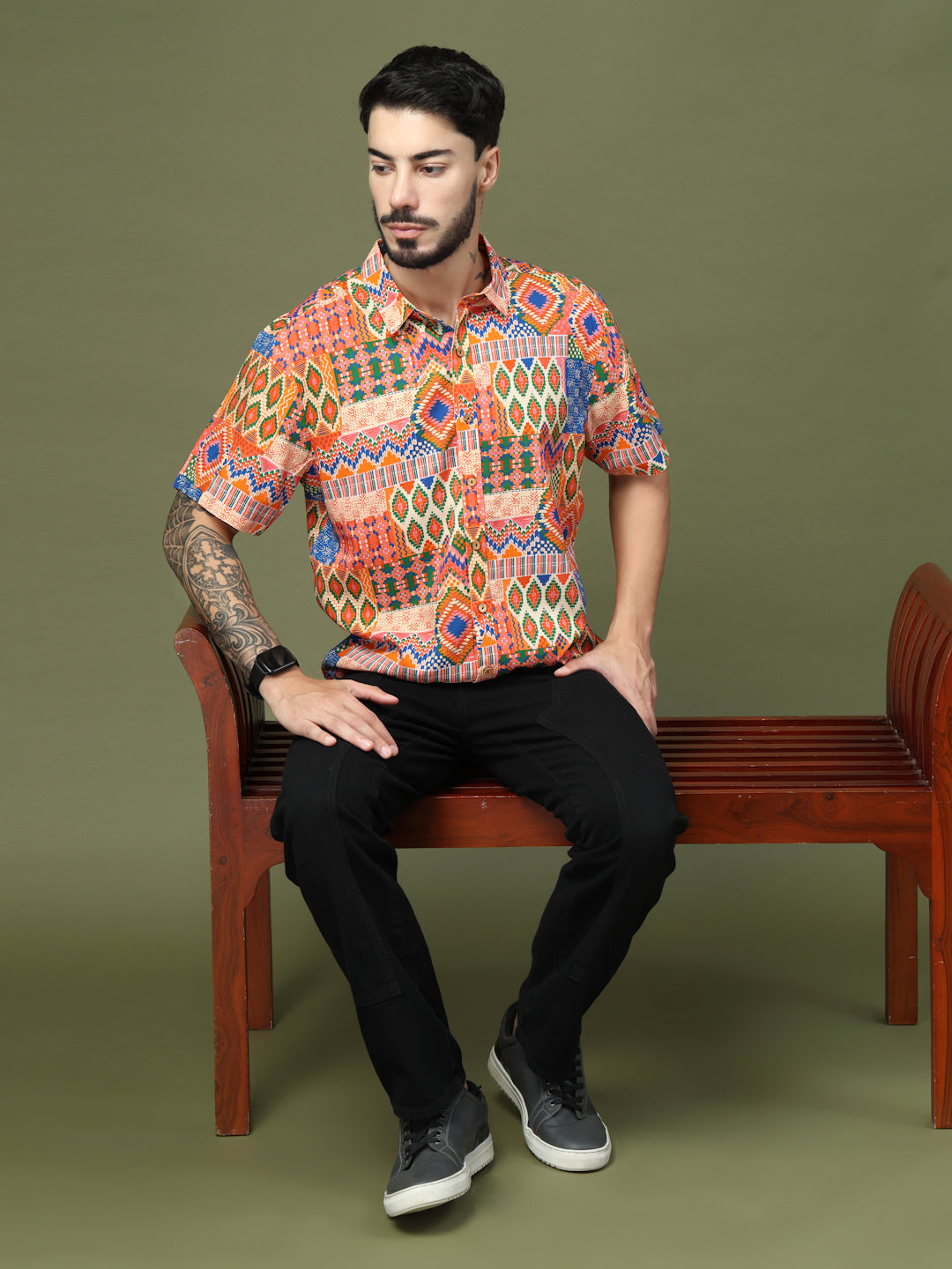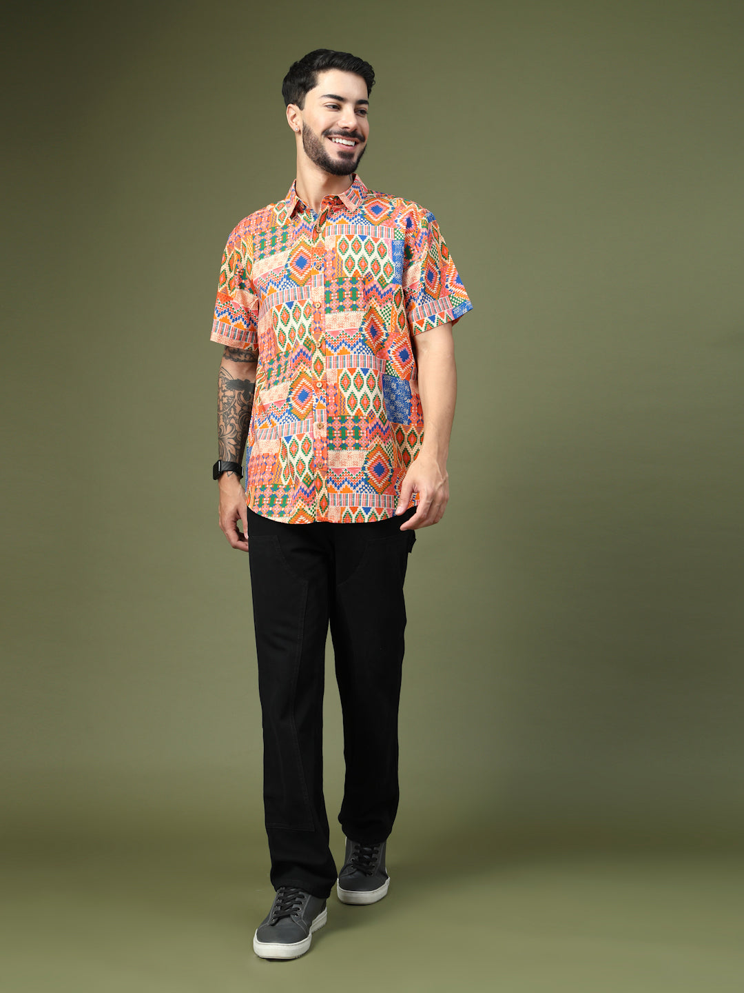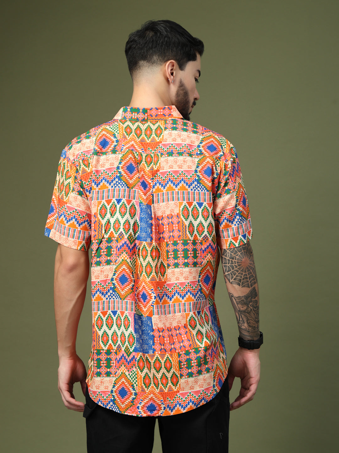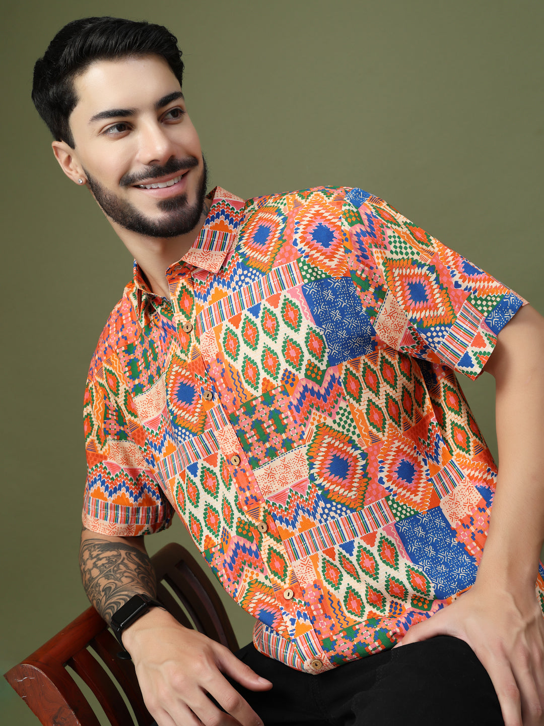 Step into the spotlight with this Vibrant Geometric Patchwork Printed Shirt, crafted from premium Pure Cotton for unmatched comfort and breathability. Featuring a bold fusion of intricate geometric motifs and ethnic-inspired patterns, this short-sleeve shirt brings a lively, festive vibe to any look. Perfect for casual outings, festive celebrations, or vacation getaways, it’s designed to make a statement while keeping you effortlessly stylish and comfortable all day long.