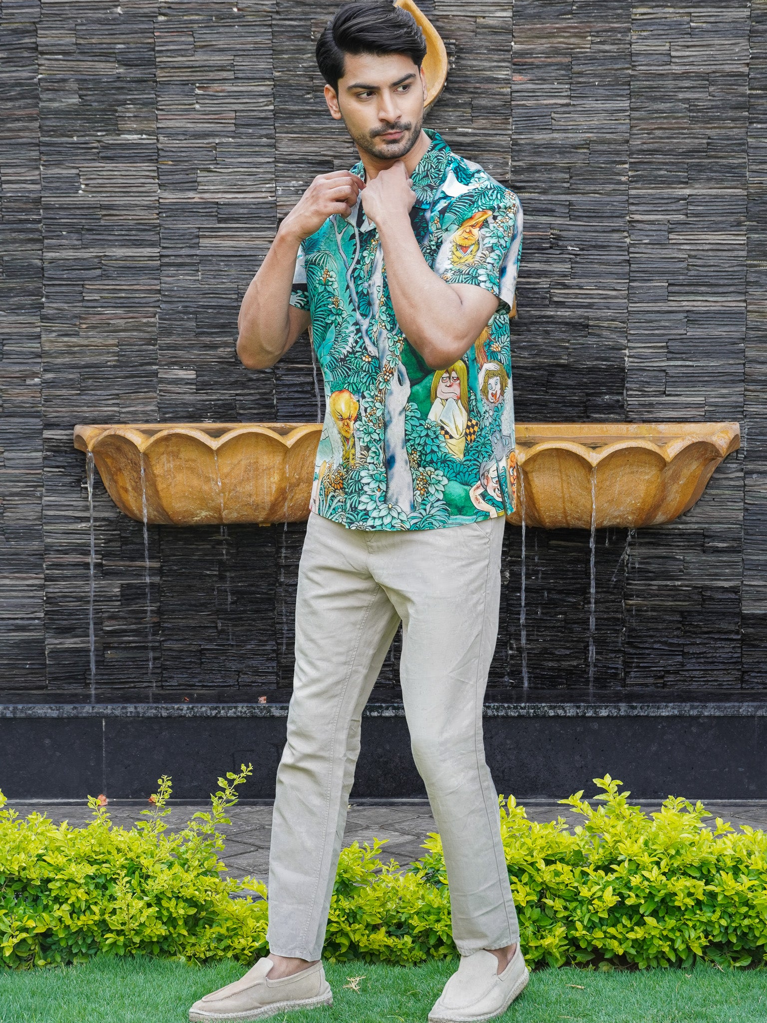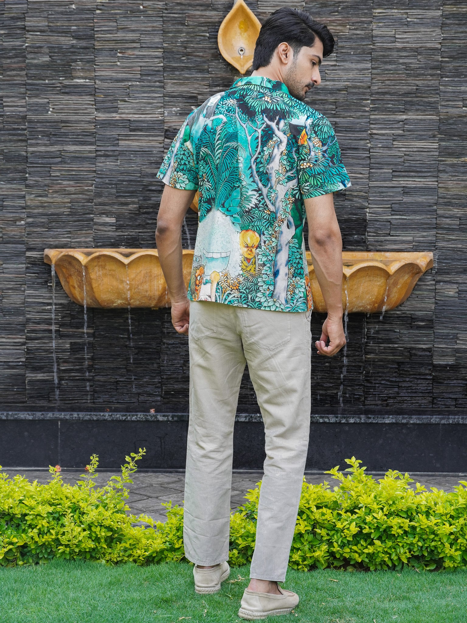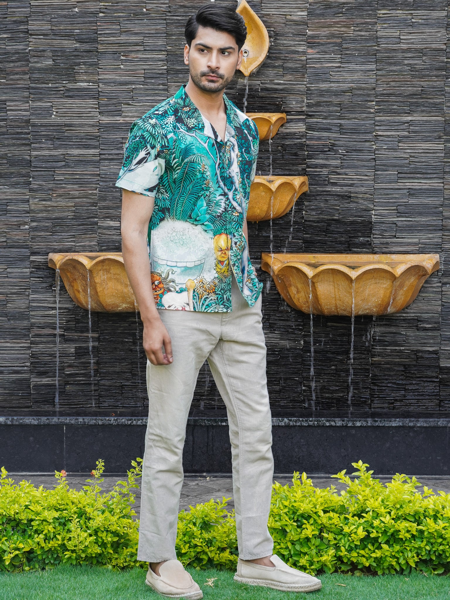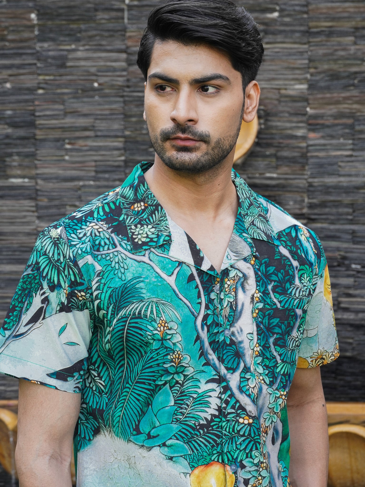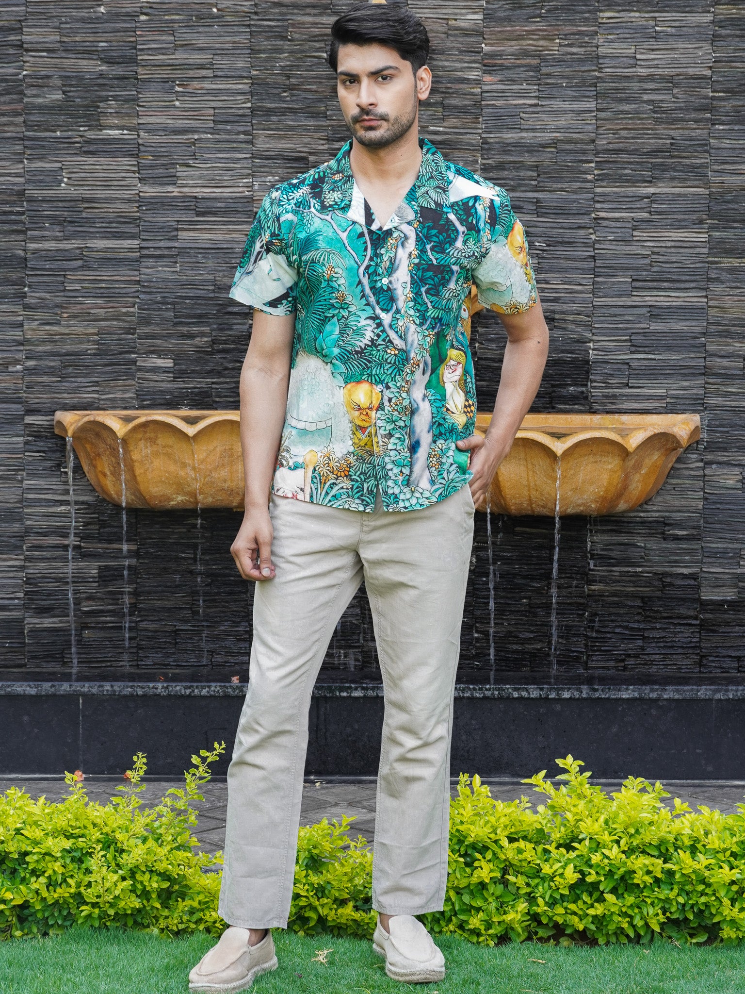 Step into bold style with this Tropical Jungle Art Printed Shirt, crafted from premiumPure Cotton Shirt for a soft, breathable, and luxurious feel. Featuring a vibrant hand-illustrated jungle motif with intricate detailing, this shirt is a true statement piece for your wardrobe. The lightweight fabric ensures all-day comfort, while the relaxed fit and short sleeves make it perfect for casual outings, vacations, or festive gatherings. Pair it with chinos or shorts for an effortlessly stylish look that stands out.