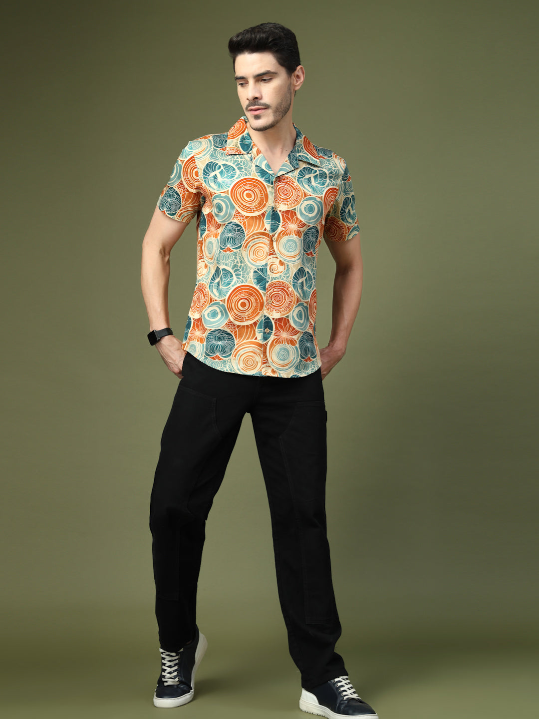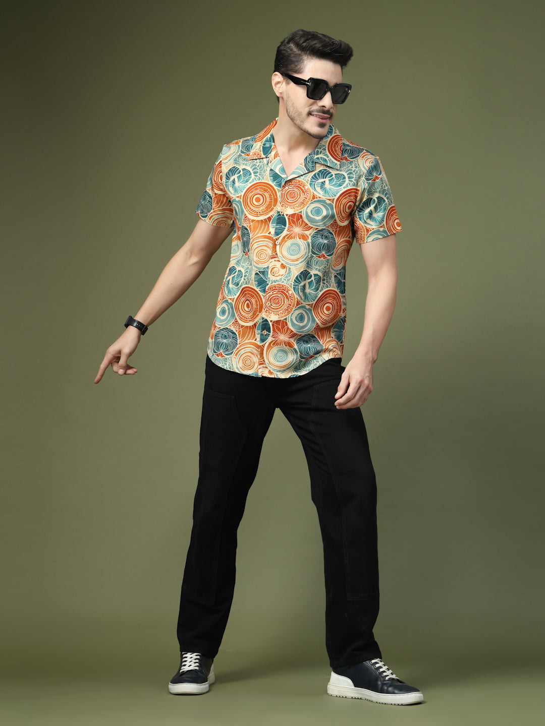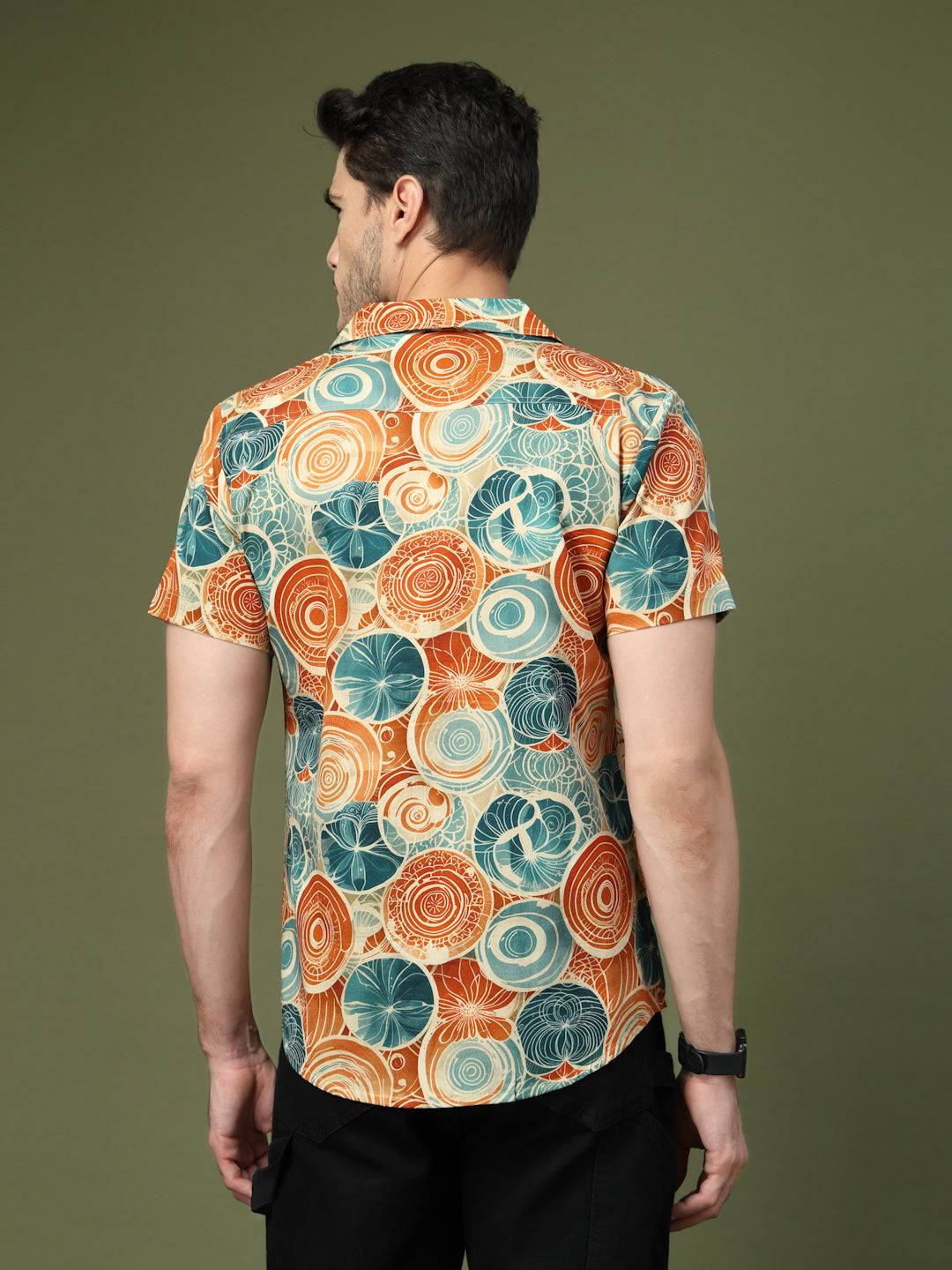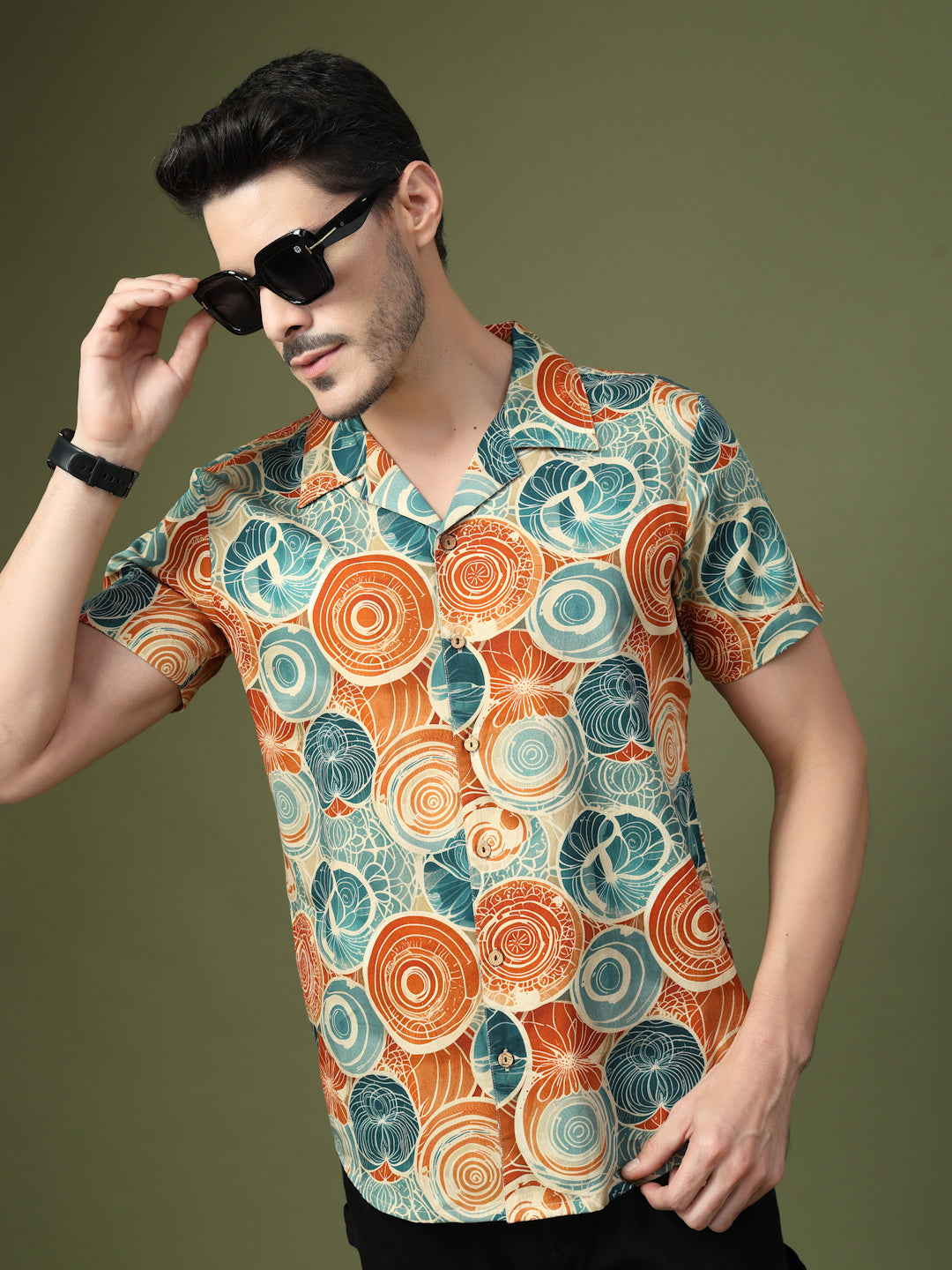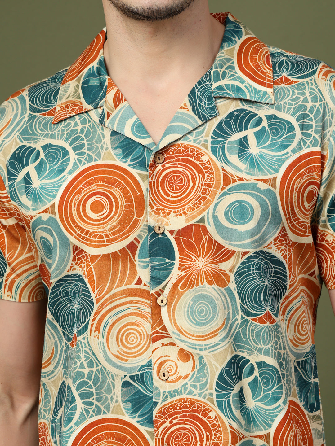 Add a unique, artistic touch to your wardrobe with this abstract circles print shirt. The design features a blend of earthy and cool tones, including shades of orange, turquoise, and beige, arranged in an eye-catching, swirling pattern. The lightweight fabric and short sleeves make it an excellent option for warm weather, while the camp collar provides a stylish, laid-back vibe.